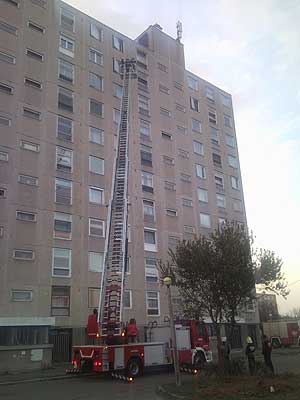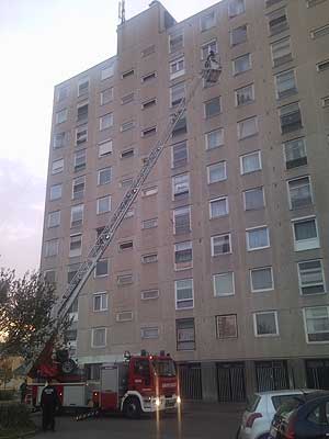 A kertvárosi városrészben található tízemeletes környékén gyorsan összeszaladtak a lakók, hogy vajon mi történt, mert a szentesi tűzoltóság az új gépjárművével a kosaras magasból mentőszerével vonult a helyszínre. Az elmúlt években több sajnálatos esetnek volt helyszíne ez az épület, és most is elindultak a találgatások. A magyarázat pedig nagyon egyszerű! Az új gépjárművel csak gyakorlatozni vonultak ehhez az épülethez. Szentes, 2008. 11. 06.