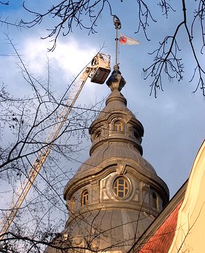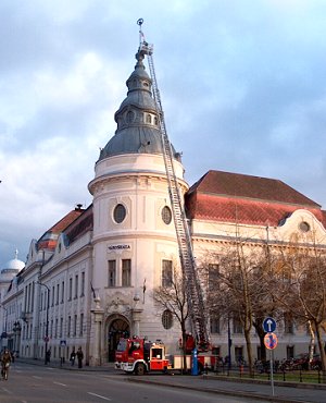 A Városháza tornyán akadt egy kis igazítani való. A munka egyúttal kezelési gyakorlatot is jelentett a szentesi lánglovagok számára. Reméljük, hogy valódi éles helyzetben minél ritkábban kell majd bevetni a 150 milliót érő létrás autót. Kép és szöveg: Tímár Ferenc Szentes, 2008. 12. 11.