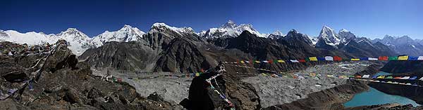Kilátás a Gokyo Ri csúcsról (5357m). A Gokyo völgy, imazászlók.