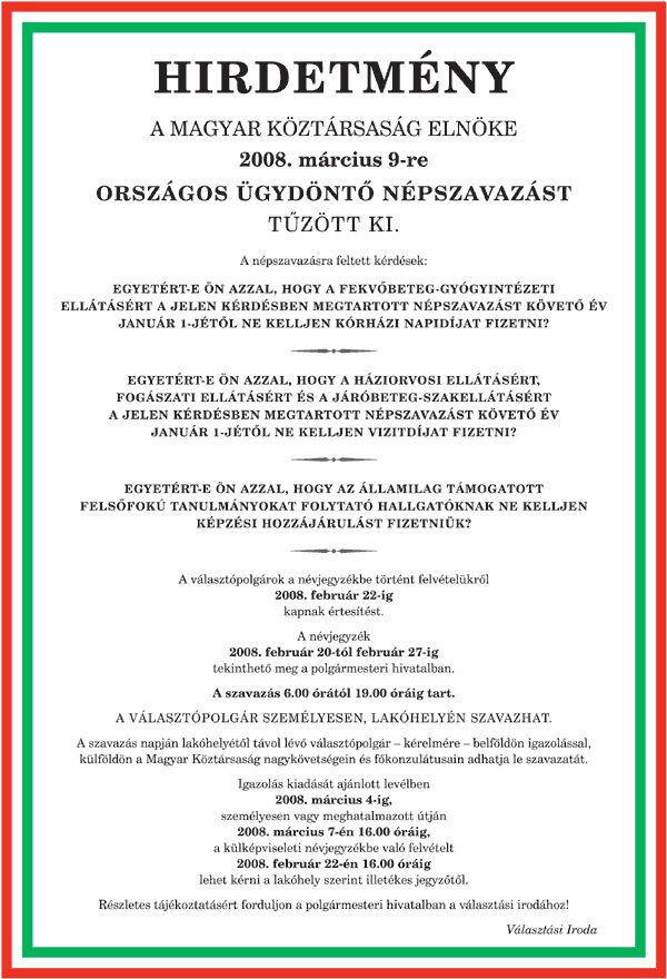 2008. március 9-én ügydöntő országos népszavazásra kerül sor a következő kérdésekben:
