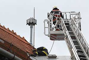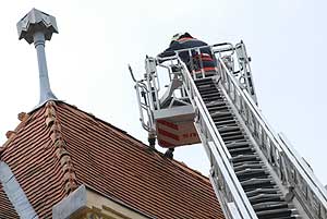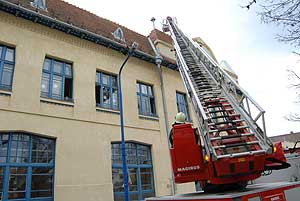A Sima Ferenc utcán, a Gyógyfürdőnél a tűzoltóknak kellett megtisztítani az utat a lehullott faágaktól. A helyőrségi klub tetejéről több cserepet lefújt a szél, de a Szent Erzsébet Katolikus Általános Iskola tetejét sem kímélte. 2008. március 3-án a vásárhelyi kosaras (létrés) mentőszer segítségét vették igénybe a szentesi tűzoltók és helyezték vissza a cserepeket. Szentes, 2008. 03. 03. |