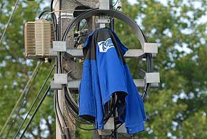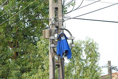 Minden nap a Bajcsy-Zsilinszky utcán járok, így nem volt nehéz felfigyelni az egyik villanypóznán ott felejtett munkásruhára. Gondolkodtam, hogy mi lehet ennek az oka, és sok gondolkodás után rájöttem, hogy talán az optikai kábel árnyékolását e módon kívánta megoldani a szakember. Ennél azért sokkal egyszerűbb lehet történet, mert szimplán csak ott maradt, miután a mester jól végezte dolgát (azaz munkáját!).