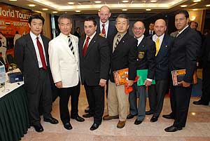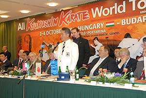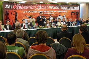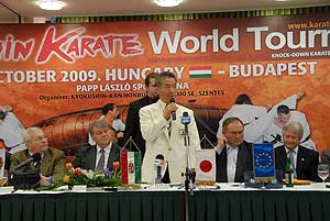 Kancho Hatsuo Royama (Kyokushin-kan) 9. danos mester szerint még látszólag rengeteg idő van a világbajnokságig, mégis nagy előrelépés, hogy a világszervezetek közül már sokan jelezték indulási szándékukat. A Kancho azt ígérte, hogy a megmérettetésen a versengésben nem számít majd, hogy melyik harcos melyik szervezet vagy ország színeiben indul, senkivel sem tesznek kivételt. Majd Hatsuo Royama a versenyzőket arra kérte, hogy teljes erejükkel és tudásukkal versenyezzenek, illetve minden jelenlévőt arra buzdított, hogy segítsék a szervező Sensei Brezovai Sándor (4. dan) munkáját. Azt pedig külön kiemelte, hogy az októberi bajnokság az első sportesemény a kyokushin karate történetében, amelyet állami sportnappá nyilvánítottak. Még több információ a VB-ről a www.karatewt.com -on! A sajtótájékoztatón taiko dobosok hívták segítségül a japán karate versenyek hagyományai szerint a harci szellemeket, a megjelentek megemlékeztek a Kyokushin Karate alapítójáról, Sosai Masutatsu Oyama mesterről (10. dan), illetve bemutatták a szervező várost, Szentest is, ahol évekkel ezelőtt már Európa bajnokságot is rendeztek a sportágban.