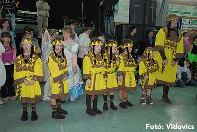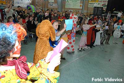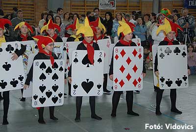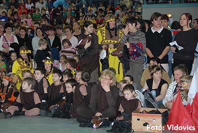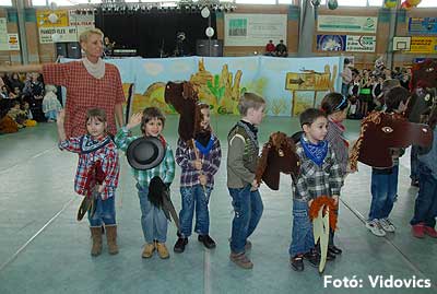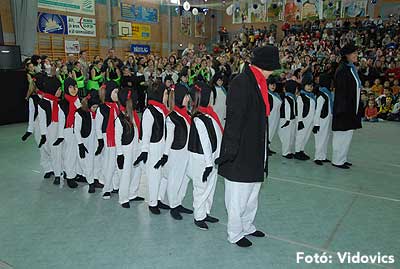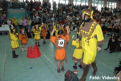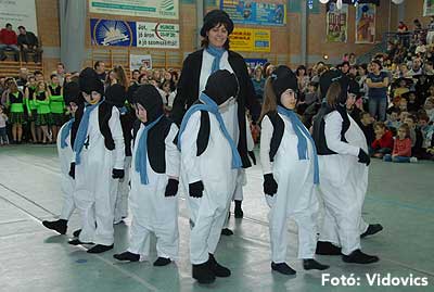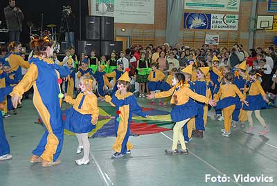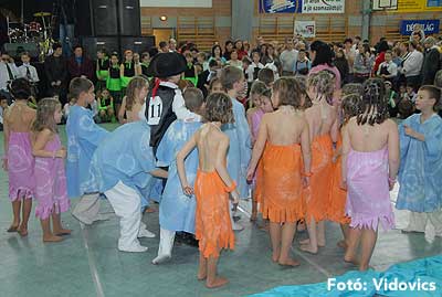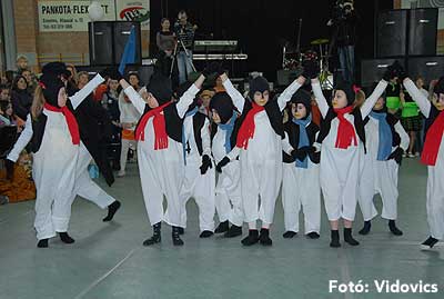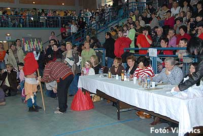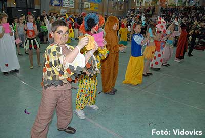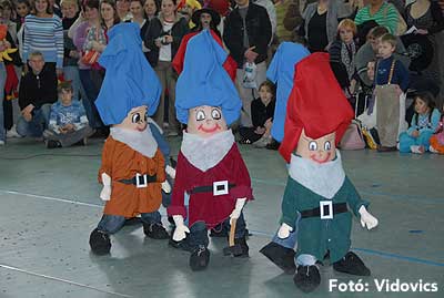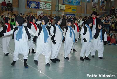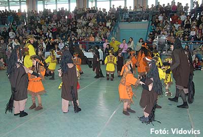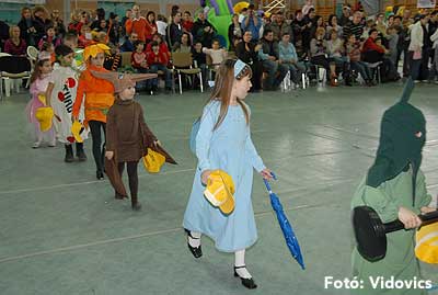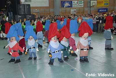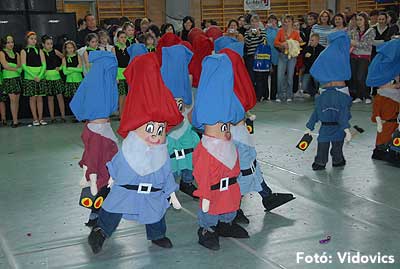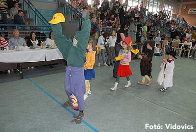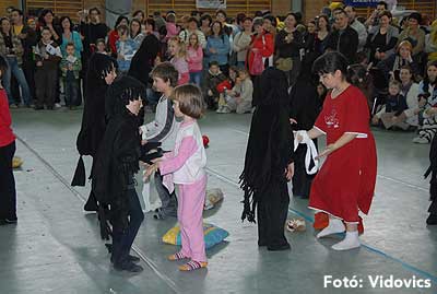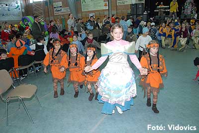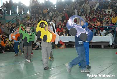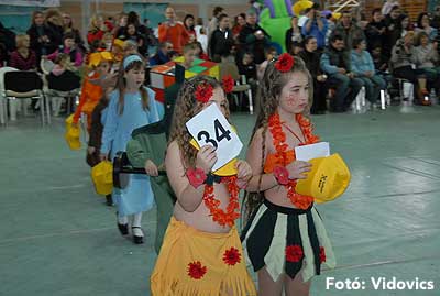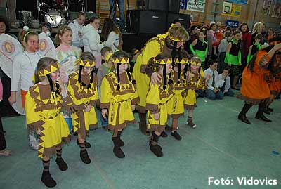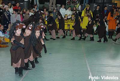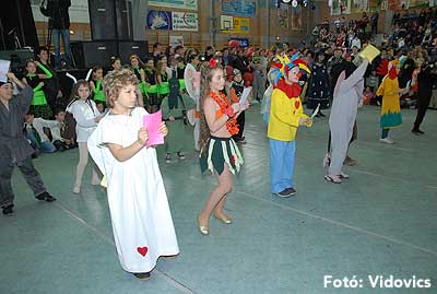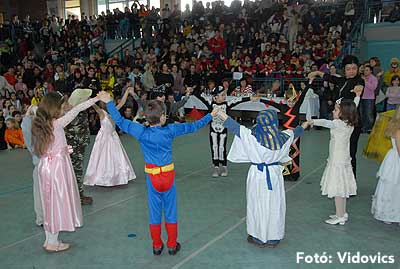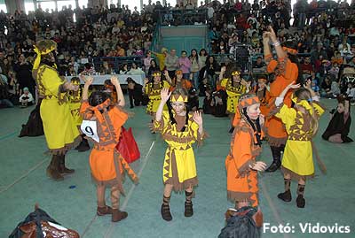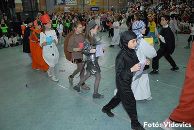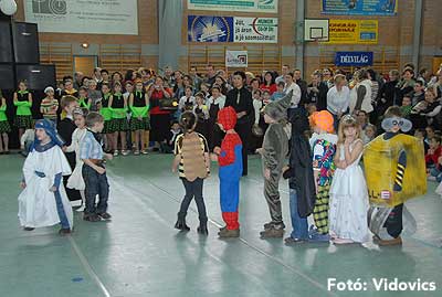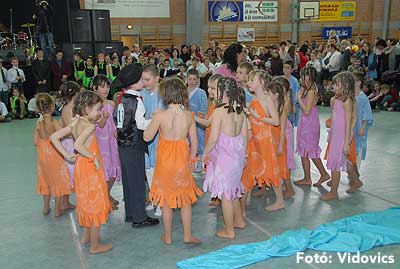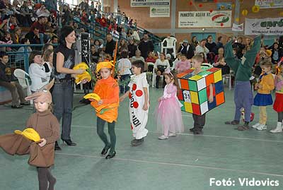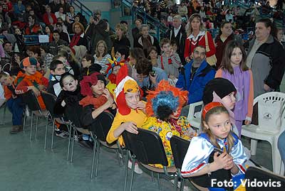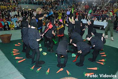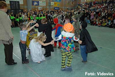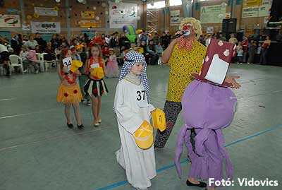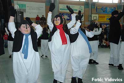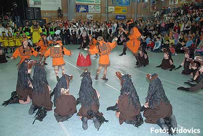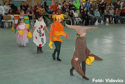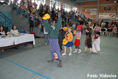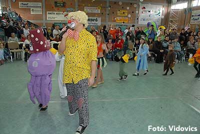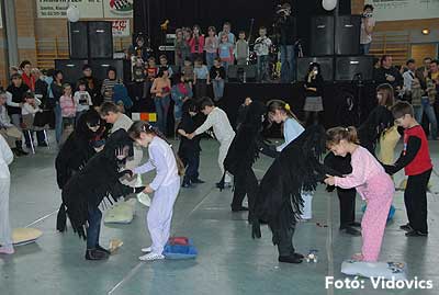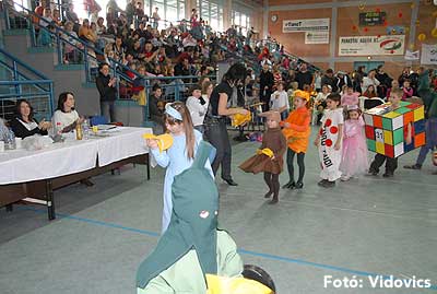 „Orrom krumpli, hajam kóc…” Másnap a Sportcsarnoké volt a főszerep; itt került megrendezésre a Városi Farsang. Először az óvodás csoportok ötletes és érdekes műsorait tekinthette meg a - főleg szülőkből álló – közönség és a zsűri, majd az iskolások következtek. Volt itt vakondtánc, törepe-nagykereskedés, de még Hófehérke afrikai kalandján is izgulhattak a nézők. Az ügyes kis csoportok csoki csomagot kaptak, amiben mindenkinek lapult egy-egy tombolaszelvény is.