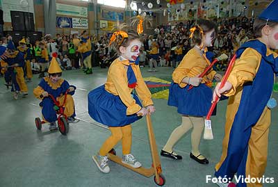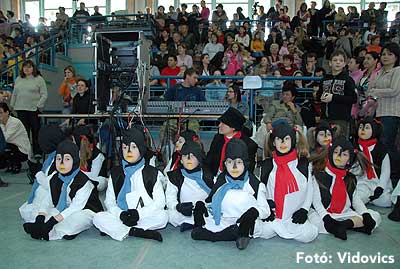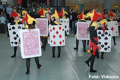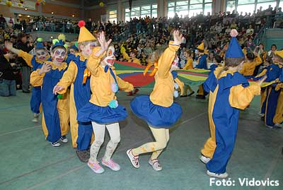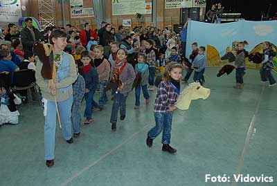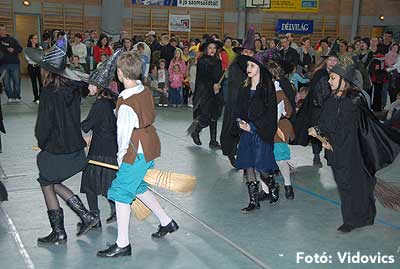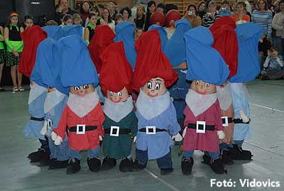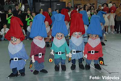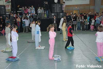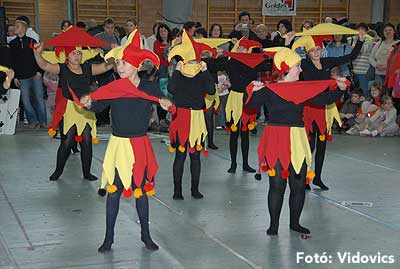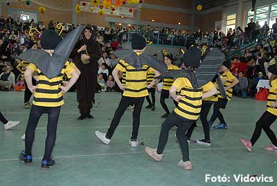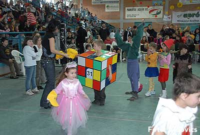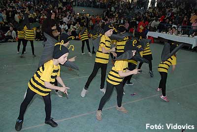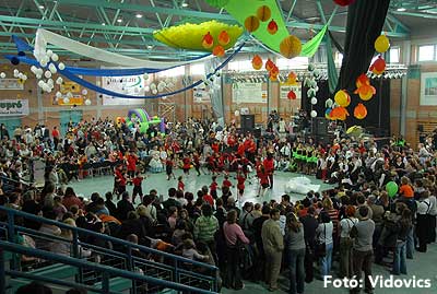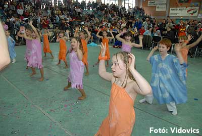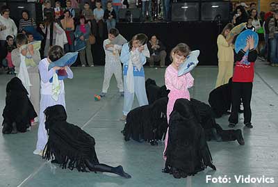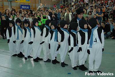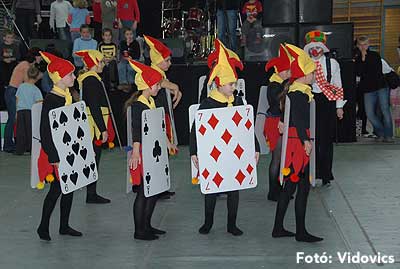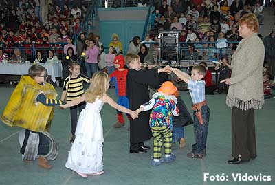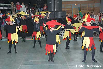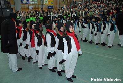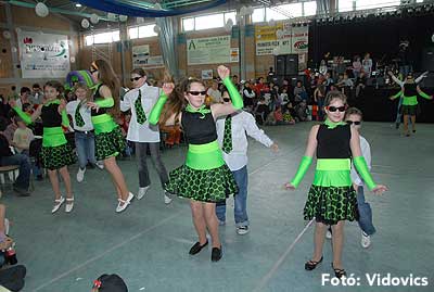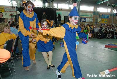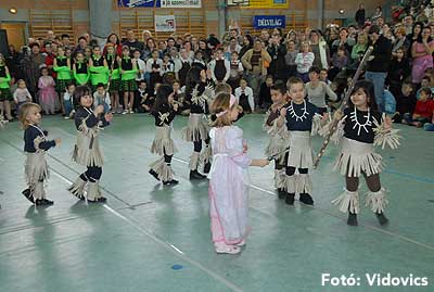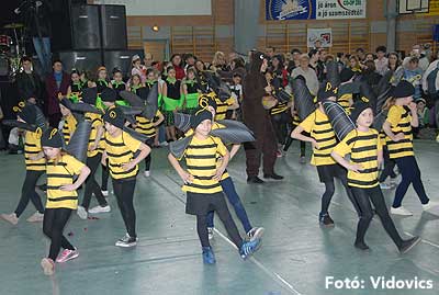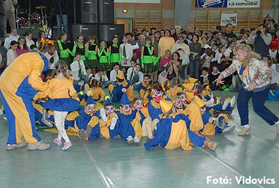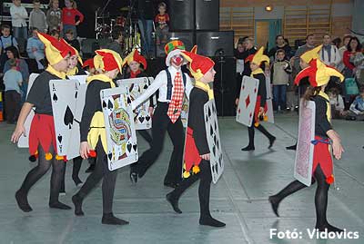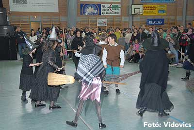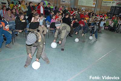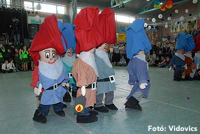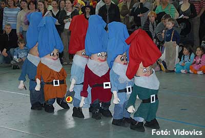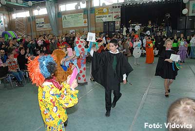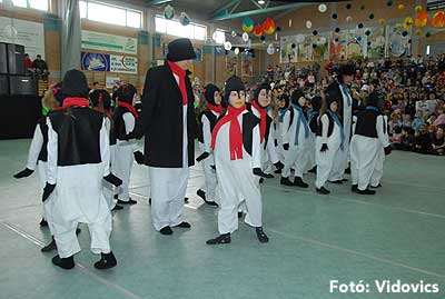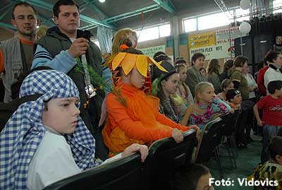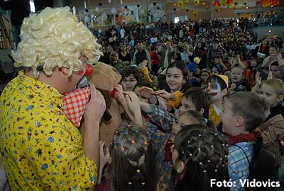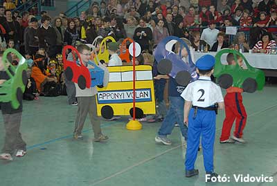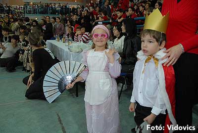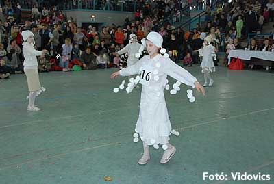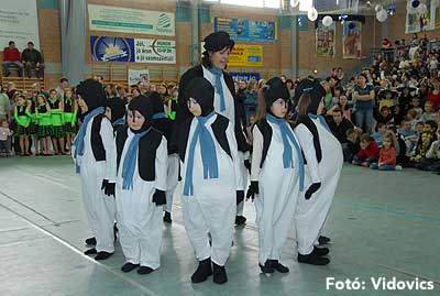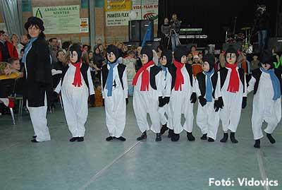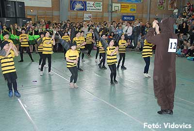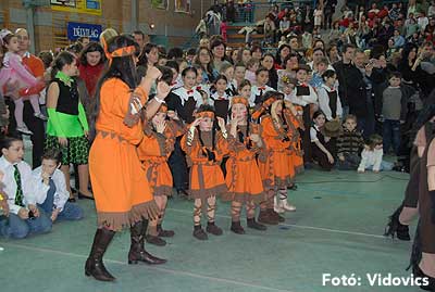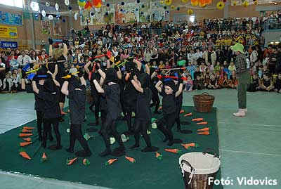 „Orrom krumpli, hajam kóc…” Másnap a Sportcsarnoké volt a főszerep; itt került megrendezésre a Városi Farsang. Először az óvodás csoportok ötletes és érdekes műsorait tekinthette meg a - főleg szülőkből álló – közönség és a zsűri, majd az iskolások következtek. Volt itt vakondtánc, törepe-nagykereskedés, de még Hófehérke afrikai kalandján is izgulhattak a nézők. Az ügyes kis csoportok csoki csomagot kaptak, amiben mindenkinek lapult egy-egy tombolaszelvény is.