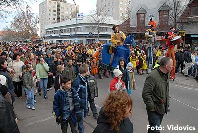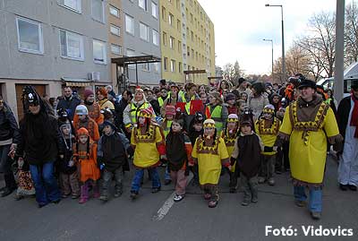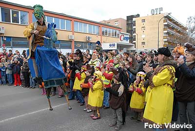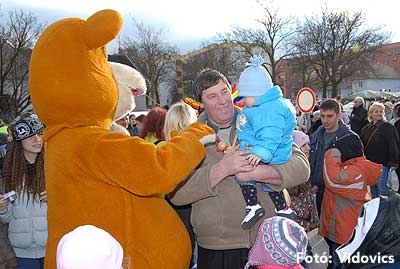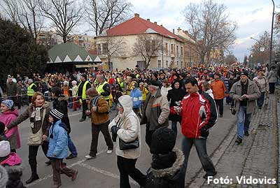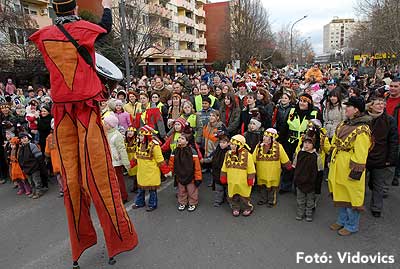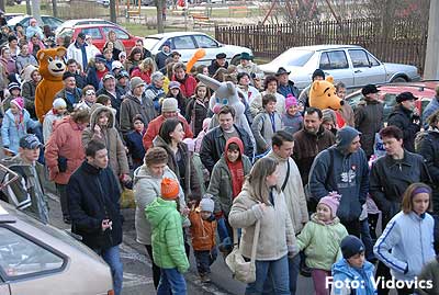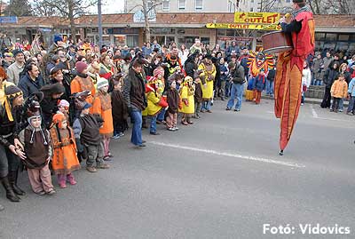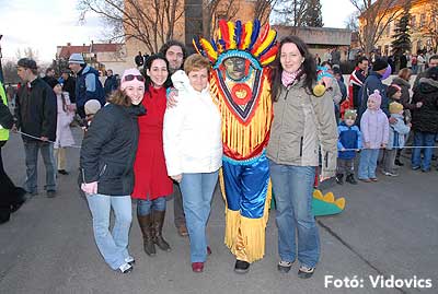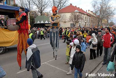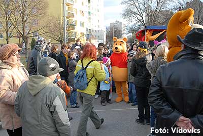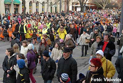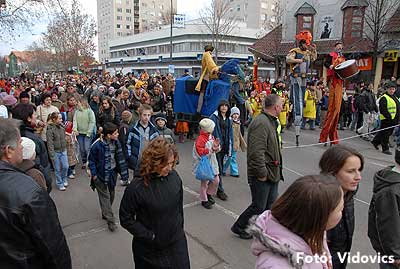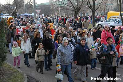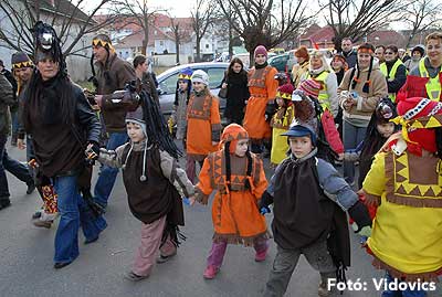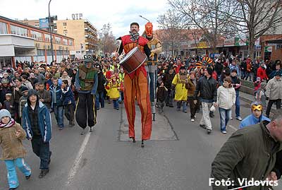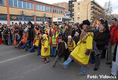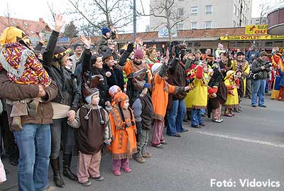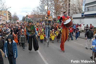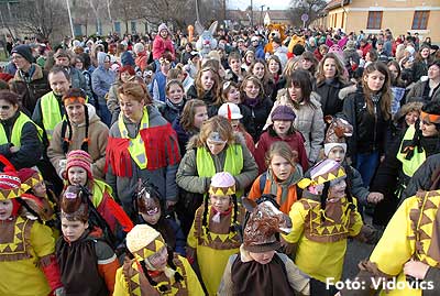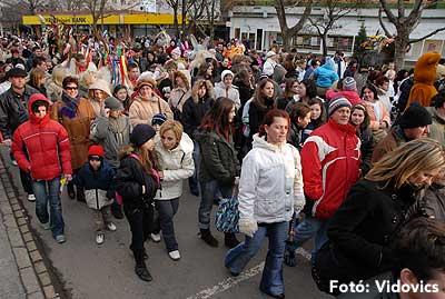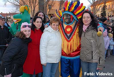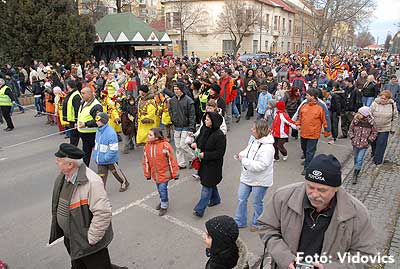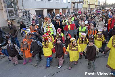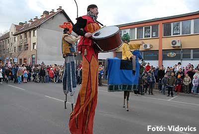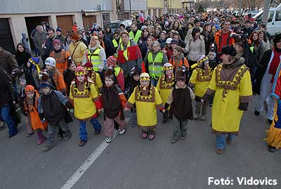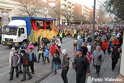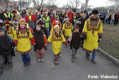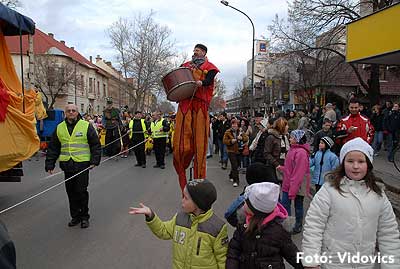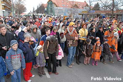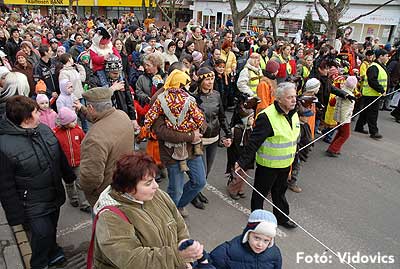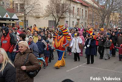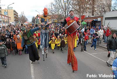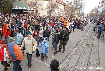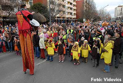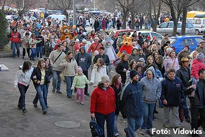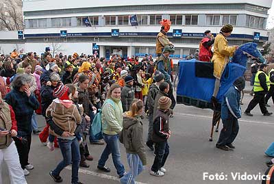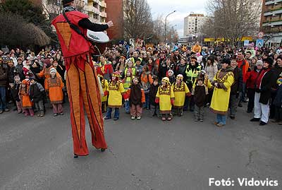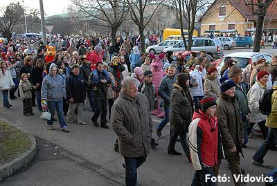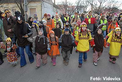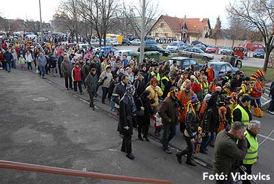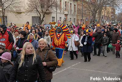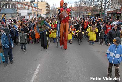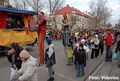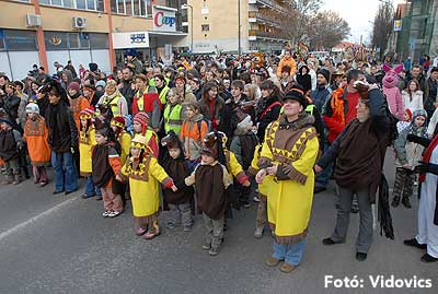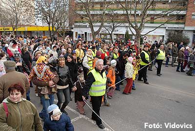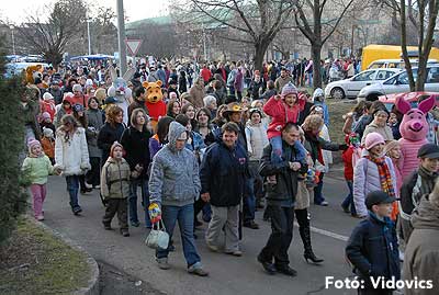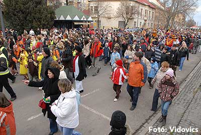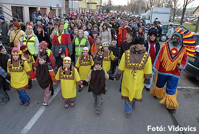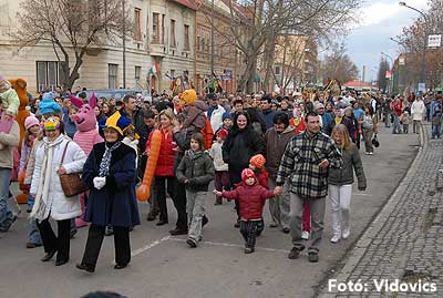 „Maskarások, bolondok, Rázzátok a kolompot! Takarodjon el a tél, Örvendezzen aki él!” A farsangi menet nem is lehet igazi álarcosok nélkül. A maszkok kiosztása után sok kis kacsa, cica, sárkány, és egyéb „herkentyű” állt be a sorba a kamion mögé és a busók elé. Megérkeztek az óriás-mesefigurák is; az immár hagyománnyá vált Mackó mellett Süsü, Nyuszi, Micimackó, Malacka és egy igazi Indián Törzsfőnök is lelkesítette a közönséget. Végre elindult a sokadalom a Sportcsarnoktól, végig a városon. A Központi ABC-nél gólyalábasok csatlakoztak a tarkabarka felvonuláshoz, majd a Városháza ablakaiból pingponglabda-eső zúdult a népes társaságra, hogy az esti tombolahúzásnál mindenkinek lehessen esélye megnyerni valamit az értékes ajándékok közül.