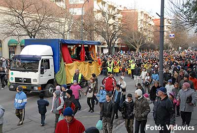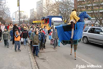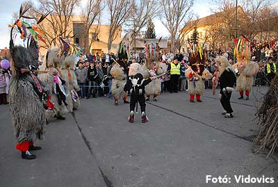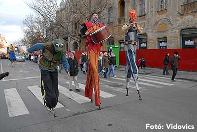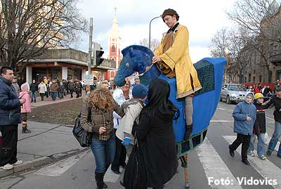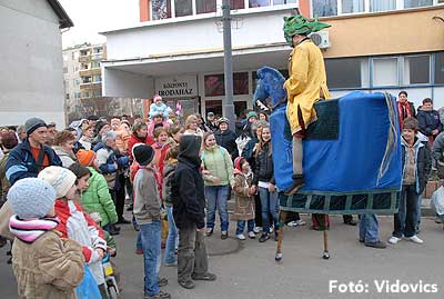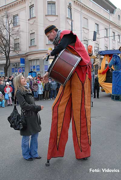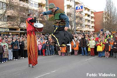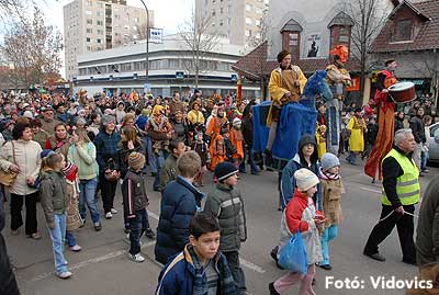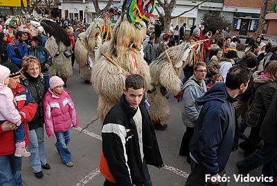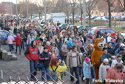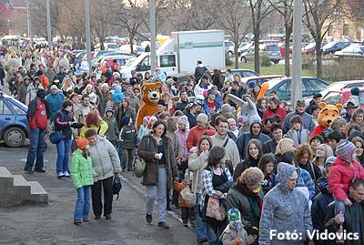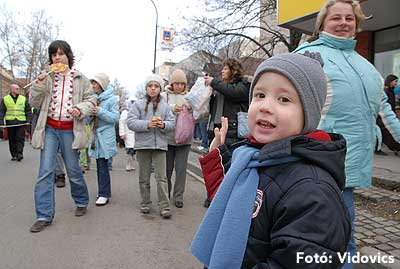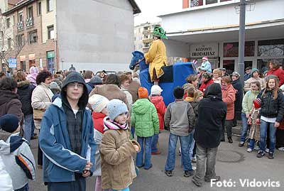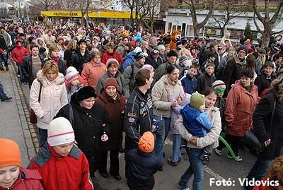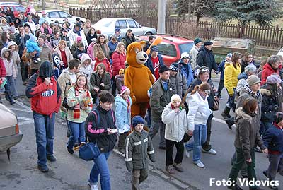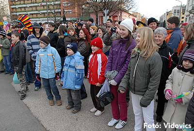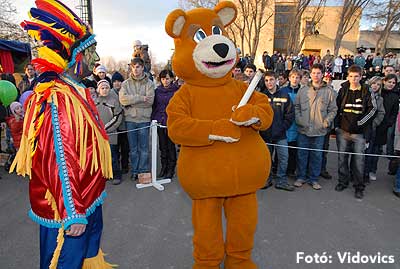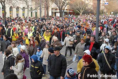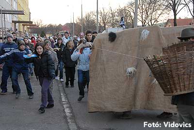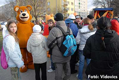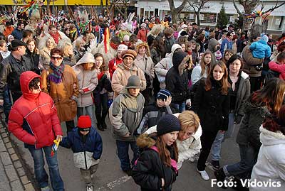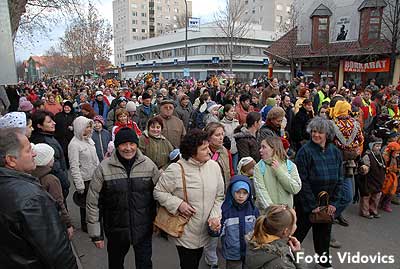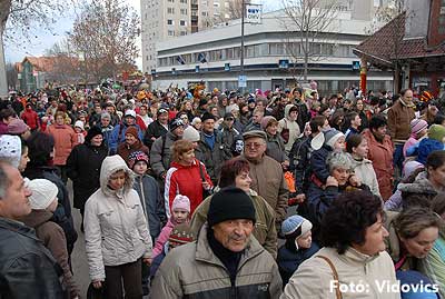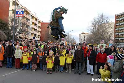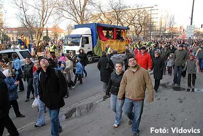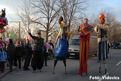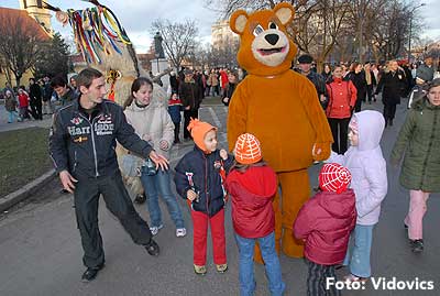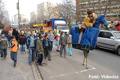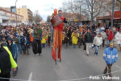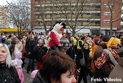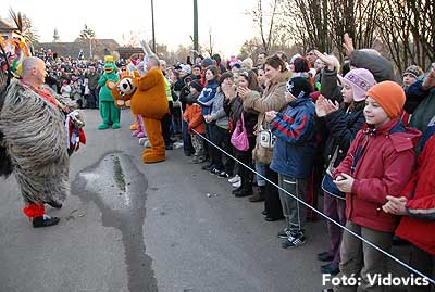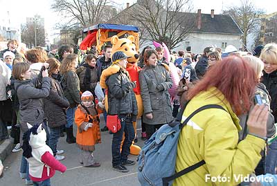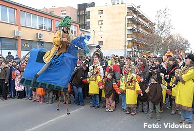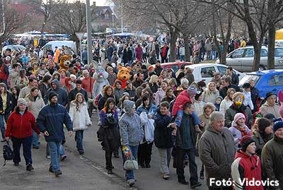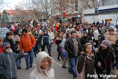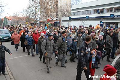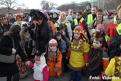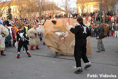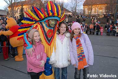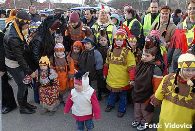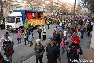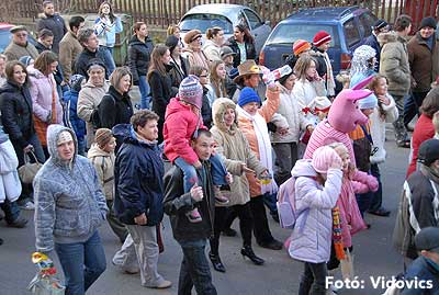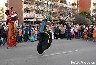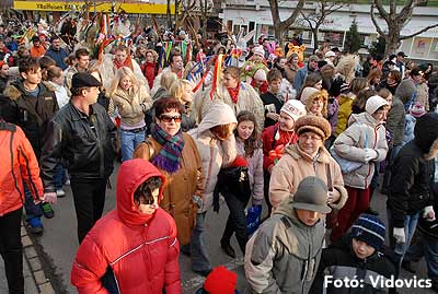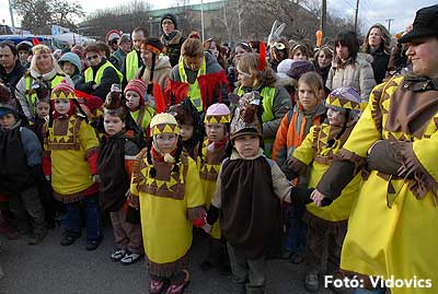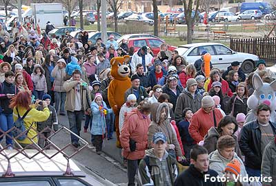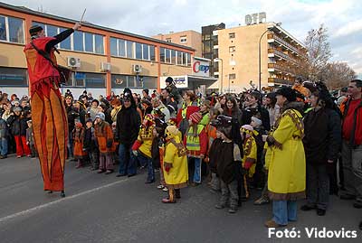 „Maskarások, bolondok, Rázzátok a kolompot! Takarodjon el a tél, Örvendezzen aki él!” A farsangi menet nem is lehet igazi álarcosok nélkül. A maszkok kiosztása után sok kis kacsa, cica, sárkány, és egyéb „herkentyű” állt be a sorba a kamion mögé és a busók elé. Megérkeztek az óriás-mesefigurák is; az immár hagyománnyá vált Mackó mellett Süsü, Nyuszi, Micimackó, Malacka és egy igazi Indián Törzsfőnök is lelkesítette a közönséget. Végre elindult a sokadalom a Sportcsarnoktól, végig a városon. A Központi ABC-nél gólyalábasok csatlakoztak a tarkabarka felvonuláshoz, majd a Városháza ablakaiból pingponglabda-eső zúdult a népes társaságra, hogy az esti tombolahúzásnál mindenkinek lehessen esélye megnyerni valamit az értékes ajándékok közül.
