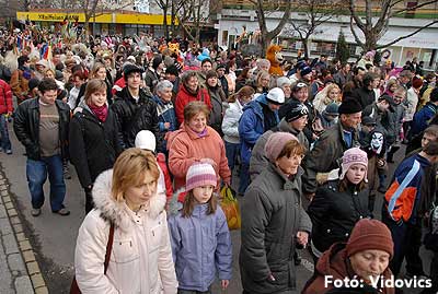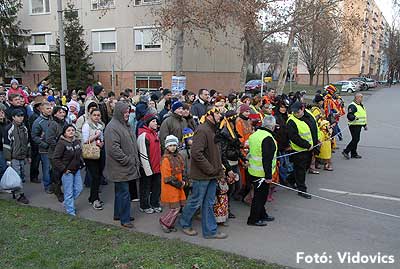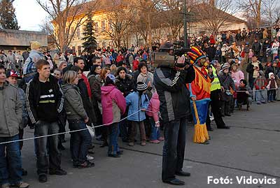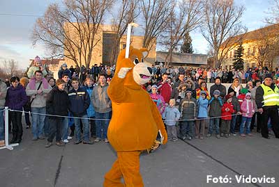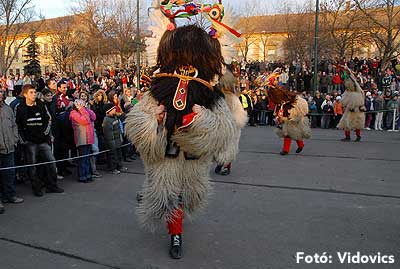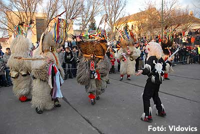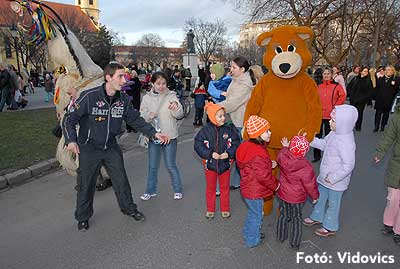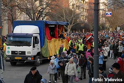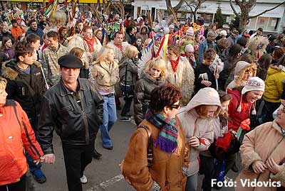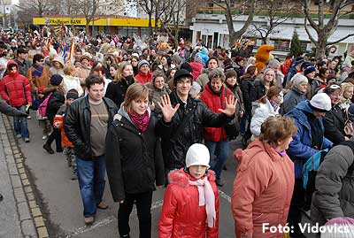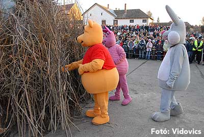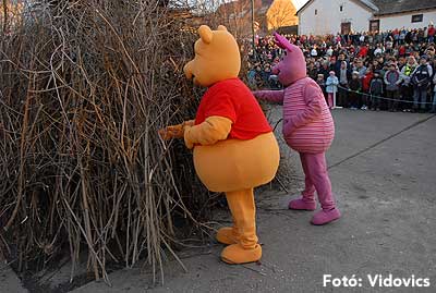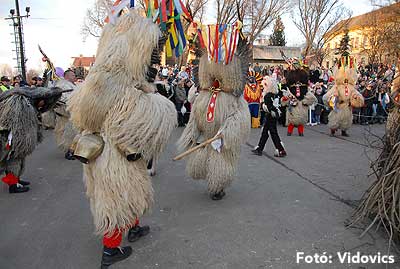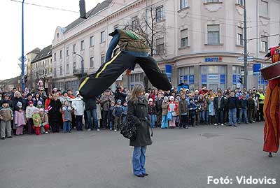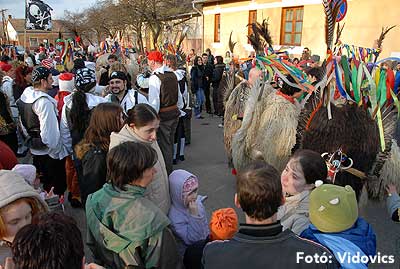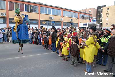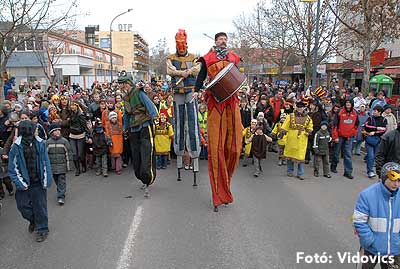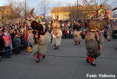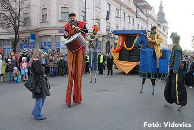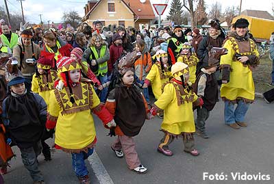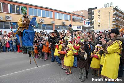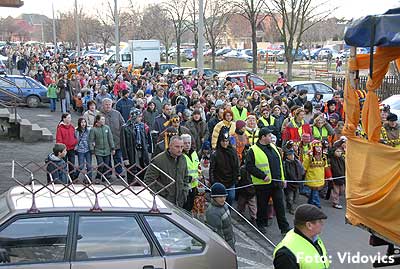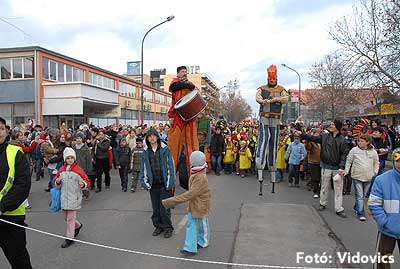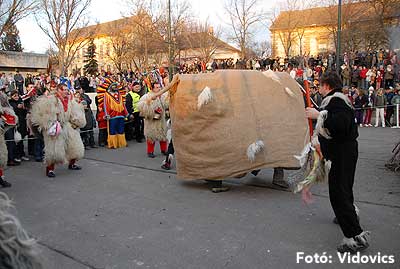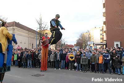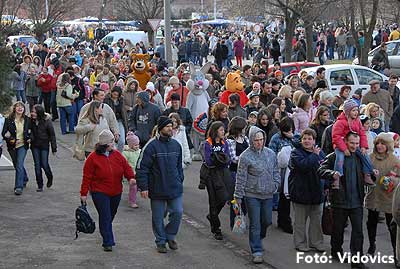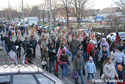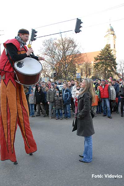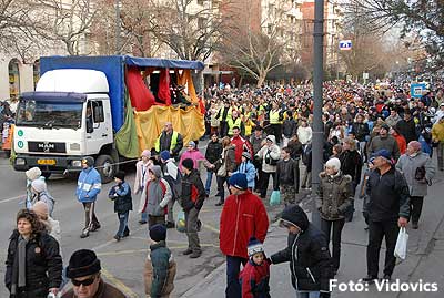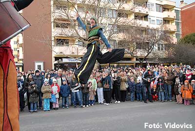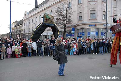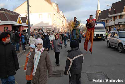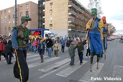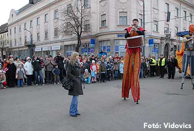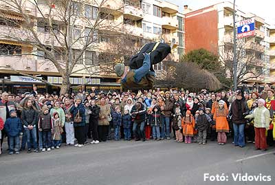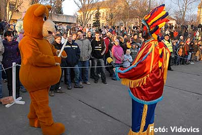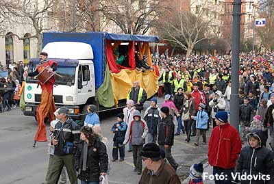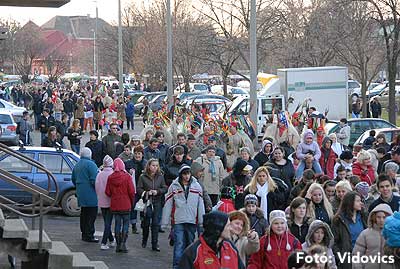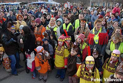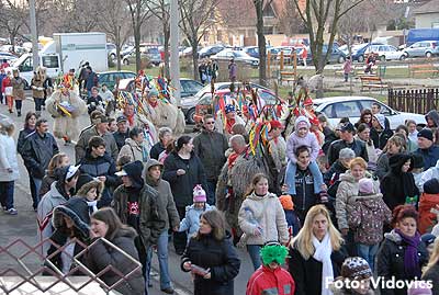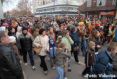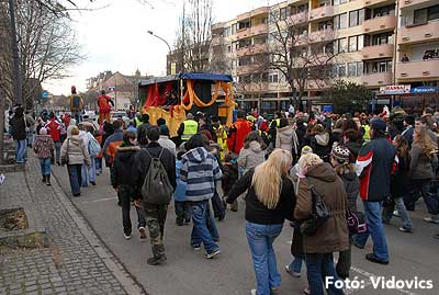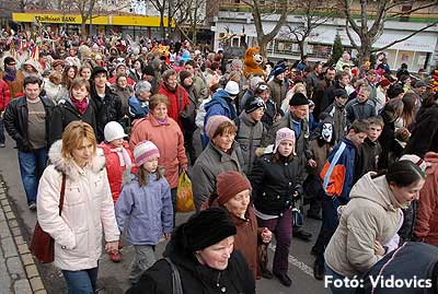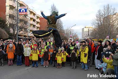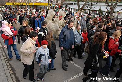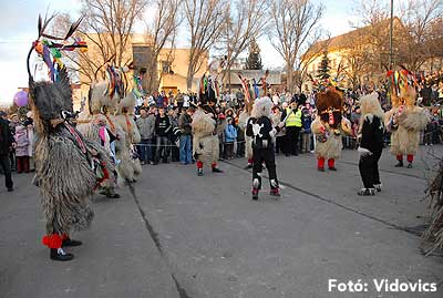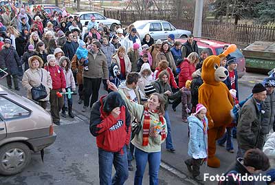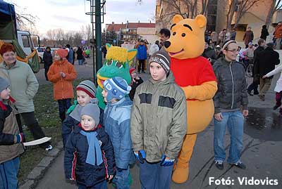 „Maskarások, bolondok, Rázzátok a kolompot! Takarodjon el a tél, Örvendezzen aki él!” A farsangi menet nem is lehet igazi álarcosok nélkül. A maszkok kiosztása után sok kis kacsa, cica, sárkány, és egyéb „herkentyű” állt be a sorba a kamion mögé és a busók elé. Megérkeztek az óriás-mesefigurák is; az immár hagyománnyá vált Mackó mellett Süsü, Nyuszi, Micimackó, Malacka és egy igazi Indián Törzsfőnök is lelkesítette a közönséget. Végre elindult a sokadalom a Sportcsarnoktól, végig a városon. A Központi ABC-nél gólyalábasok csatlakoztak a tarkabarka felvonuláshoz, majd a Városháza ablakaiból pingponglabda-eső zúdult a népes társaságra, hogy az esti tombolahúzásnál mindenkinek lehessen esélye megnyerni valamit az értékes ajándékok közül.