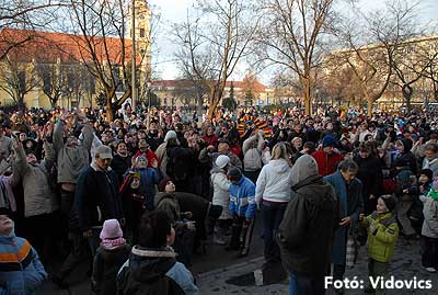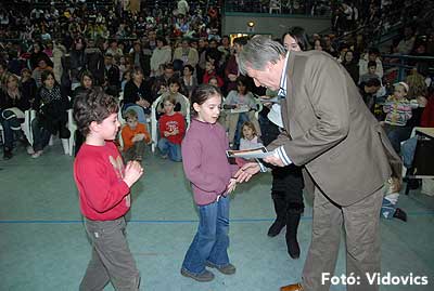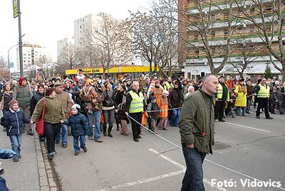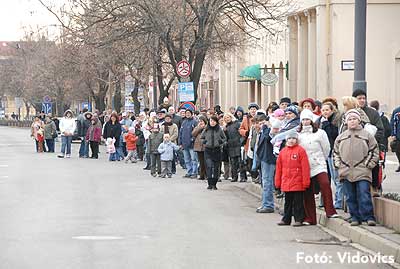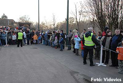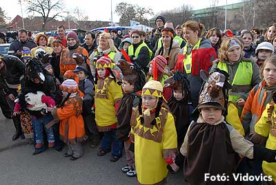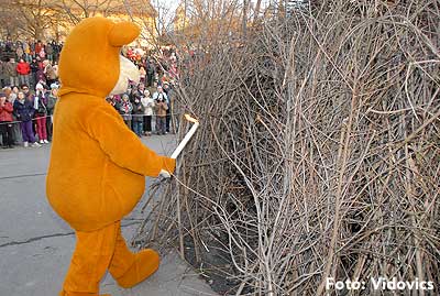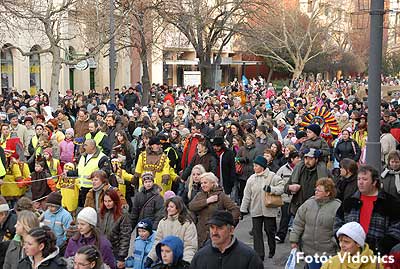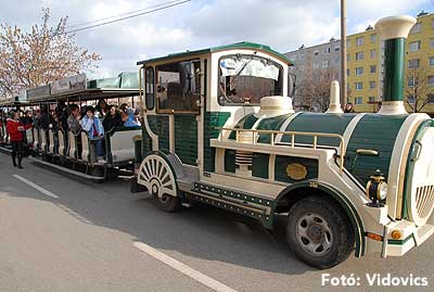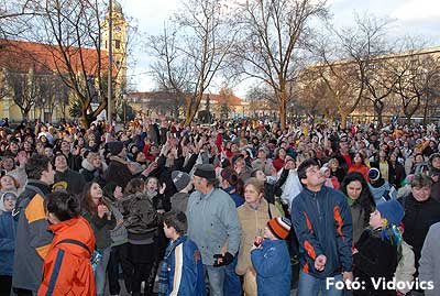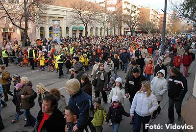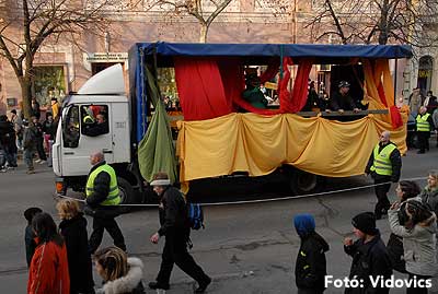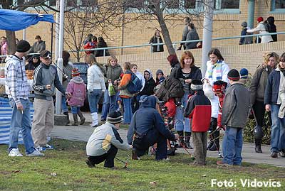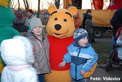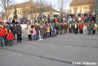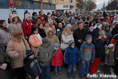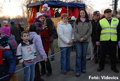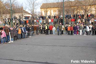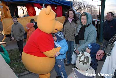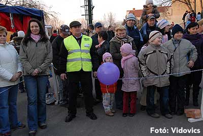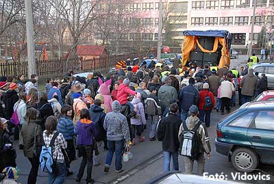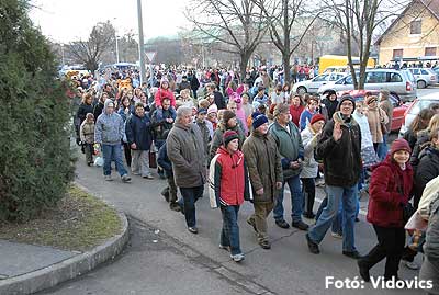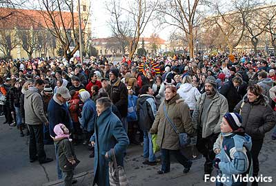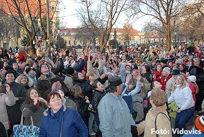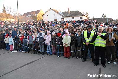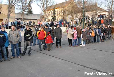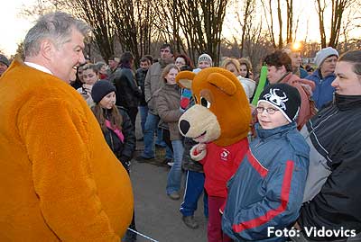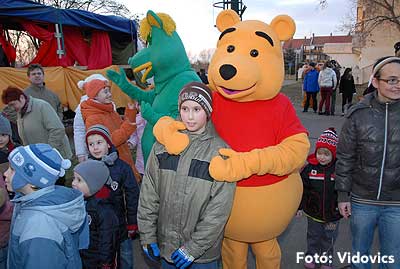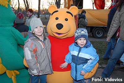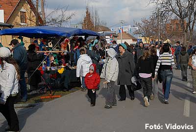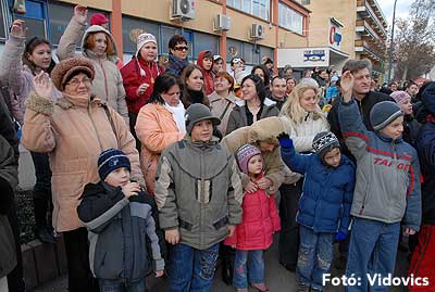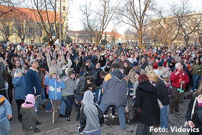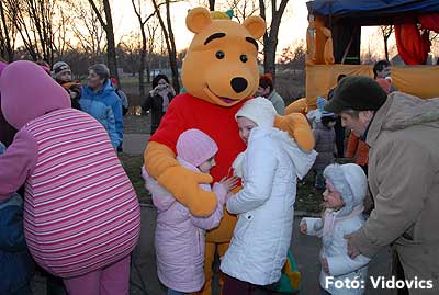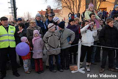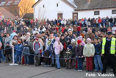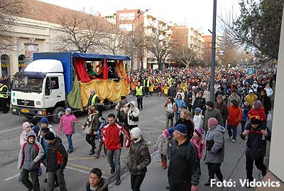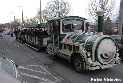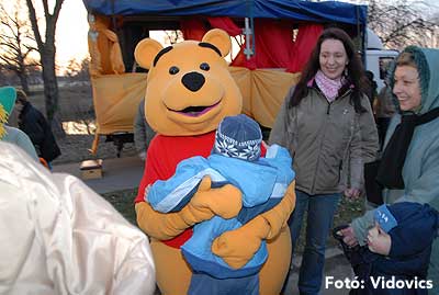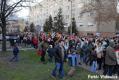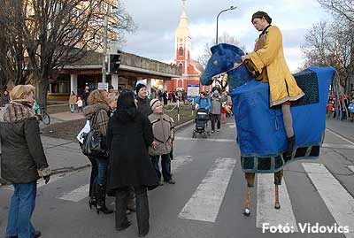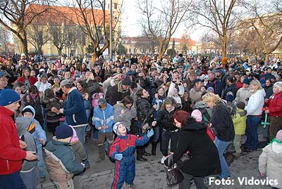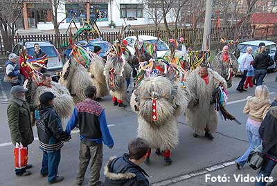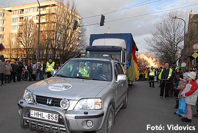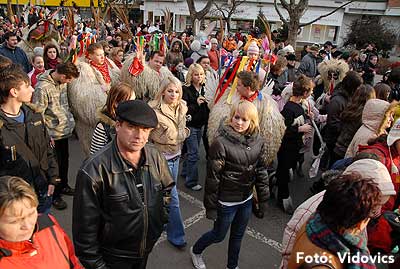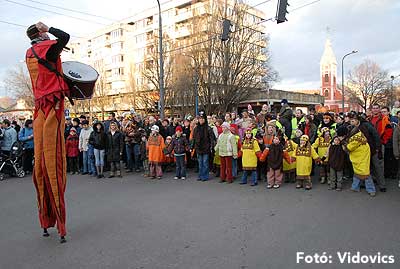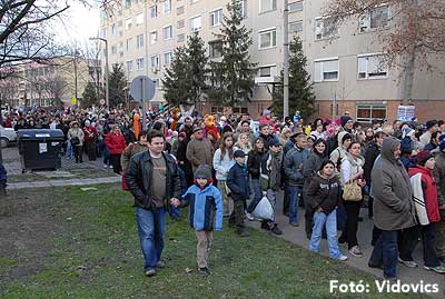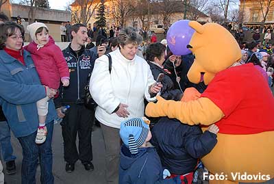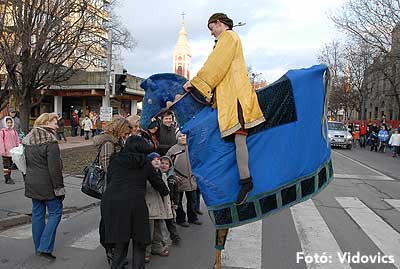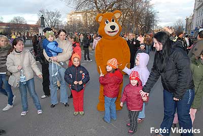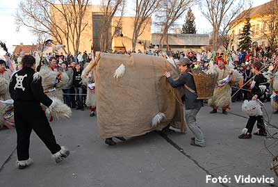 „Maskarások, bolondok, Rázzátok a kolompot! Takarodjon el a tél, Örvendezzen aki él!” A farsangi menet nem is lehet igazi álarcosok nélkül. A maszkok kiosztása után sok kis kacsa, cica, sárkány, és egyéb „herkentyű” állt be a sorba a kamion mögé és a busók elé. Megérkeztek az óriás-mesefigurák is; az immár hagyománnyá vált Mackó mellett Süsü, Nyuszi, Micimackó, Malacka és egy igazi Indián Törzsfőnök is lelkesítette a közönséget. Végre elindult a sokadalom a Sportcsarnoktól, végig a városon. A Központi ABC-nél gólyalábasok csatlakoztak a tarkabarka felvonuláshoz, majd a Városháza ablakaiból pingponglabda-eső zúdult a népes társaságra, hogy az esti tombolahúzásnál mindenkinek lehessen esélye megnyerni valamit az értékes ajándékok közül.