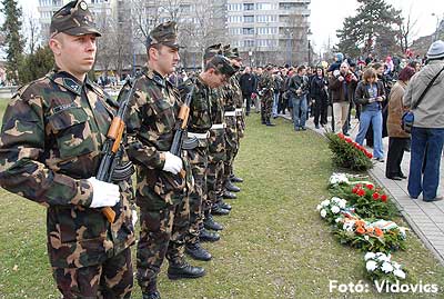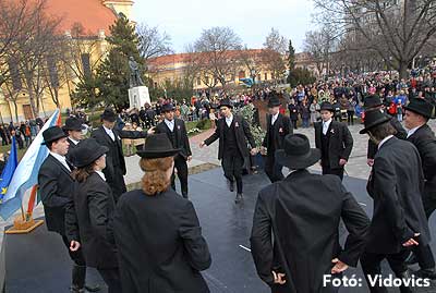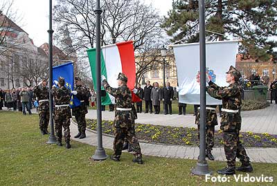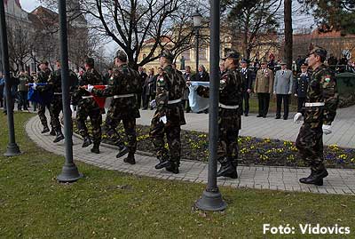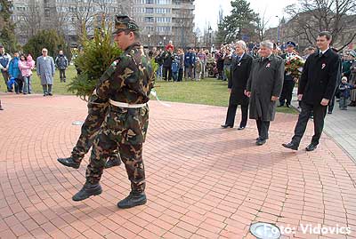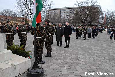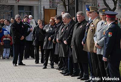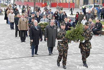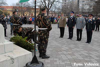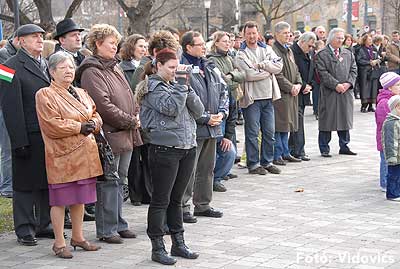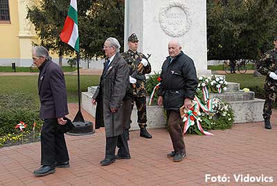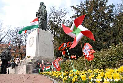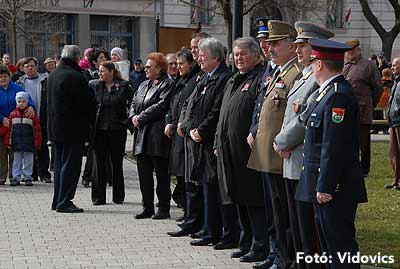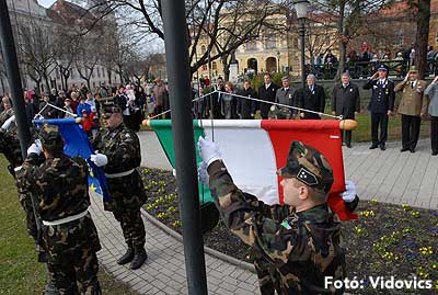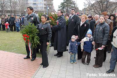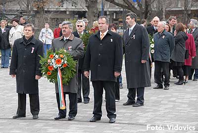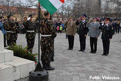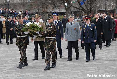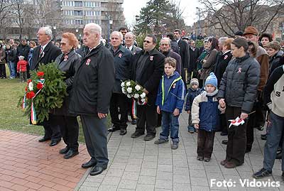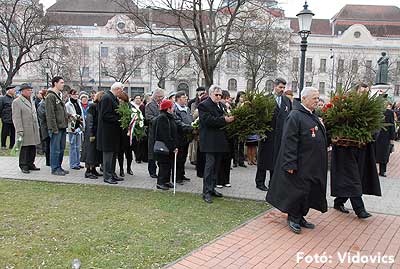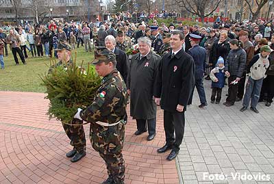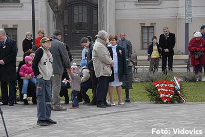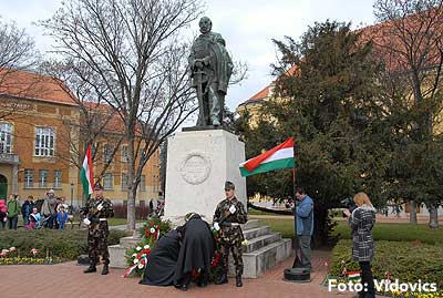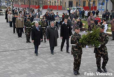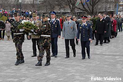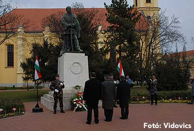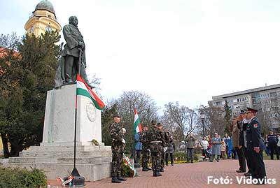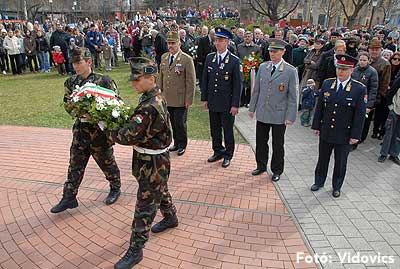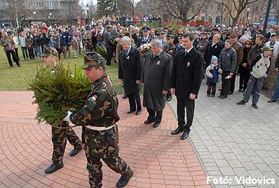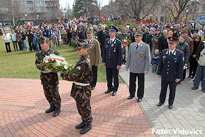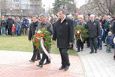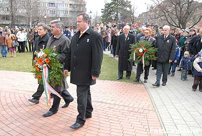 A zászlófelvonás és az ünnepi műsort követően az önkormányzat, fegyveres erők és testületek, helyi párt- és civil szervezetek képviselői helyezték el a megemlékezés koszorúit Kossuth Lajos és Horváth Mihály szobránál.