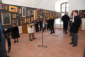 Egy lépés és itt a harmadik paraván, kezdjük a körtefa gyümölcsével, mely megérett, lepottyant és megaszalódott, mellette az apostolok sétabotja Erdélyből, de láthat még ott „műanyag fát" egy szegedi temetőből, vagy bükki korall gombát, szép barokkos keretben és egy csápot növesztő, térbe markoló platán ágat a budapesti Szabadság térről. A negyedik paraván egy diófa kérgének belsejével kezdődik. Mellette egy kirojtolódott platán termés Tokajból, a fenyőtoboz Szegedről való, a fája alatt még József Attila is sétált. Alatta a nagy vízszintes kép platán ága a Nemzeti Színház melletti megerőszakolt, irányított növekedésű fákról egy nyesedék. A darázsfészek is fából van, a darazsak a fákról lemart famorzsalékot a nyálukkal összeragasztják és formázzák ötszöggé ( honnan tanultak ők matematikát), a szivarfa termése kereszté alakítva a Rózsa Gábor térről származik. A keretre ragadó vadszőlő indát egy vihar tépte le a falról, a kiluggalt diókéreg harkályt sejtet és valamilyen lárvát a kéreg alatt. A kis fa mint egy óriás bükk mered az égig, mint a bükki Nagymező hagyás fái, a két bükkfa szilánk pedig egy szilánkja a tavaly november 30.- i bükki nagy szélviharnak amikor 5 perc alatt 20.000 köbméter fa feküdt a földre, holtbéli tájat idézve a Vadász völgyben. Az utolsó előtti paravánon láthat gombát a Zemplénből, egy kecses táncos lányt dióágból, egy szív alakú diót Tokajból, a keretet szűknek érző nyárfa ágat a szentesi Tisza partról és végül a legkisebb keretbe zárt életet egy rügyecskét.