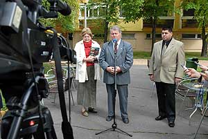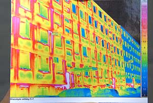 A sajtótájékoztatón Csányiné Bakró Nagy Vera aljegyző asszony elmondta, hogy ő az egyik "élő példa" a felújítás hasznosságának tapasztalója, mert az elmúlt programban a saját lakása is felújításra került. Aki bizonytalankodik a felújítás eredményében, annak itt egy hő fénykép, melyet a Brusznyai sétány 5-7 háztömbről készítették. Jól látható, hogy a felújított rész tiszta kék a képen míg a másik háztömb tiszta színes a hőfoltoktól. A színskálán jól leolvasható, hogy majdnem 7 °C a különbség a két épület falhőmérséklete között. Szentes, 2009. 04. 26.