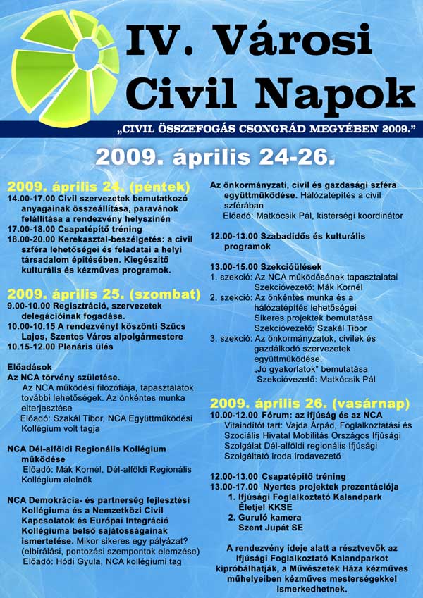 Immár negyedik éve rendezik meg a szentesi civilek a város önkormányzatával összefogásban a Civil Napot. Minden évben más-más vezérfonal mentén: városi, térségi, hálózatépítő nap zajlott le 2006-2008-ban. Idén a Művelődési Iroda koordinációja mellett jelentős civil együttműködés alakult ki, amelynek eredménye a Szivárvány Alapfokú Művészeti Iskoláért Alapítvány NCA-hoz benyújtott pályázata. Ennek segítségével előreláthatólag sikerül forrást teremteni még szélesebb körű, hosszabb időtartamú szakmai tanácskozásra.