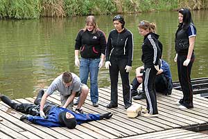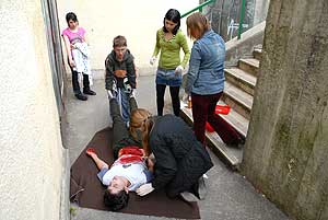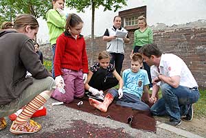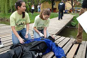 A "gödör" melletti úton, ahol a kerékpárútra lehet ráhajtani, egy gyermek esett el kerékpárjával, és az artériáját felsértve kért segítséget az arra közlekedőktől. Na jó itt befejezzük, de volt még számos sérült volt a területen, de mindenkinek feltűnhetett, hogy a sors ennyire nem lehet kegyetlen hozzánk! Hát nem is, de a helyszínek jó alkalmat teremtettek a Megyei Elsősegélynyújtó Verseny résztvevőinek, hogy bemutassák tudásukat a gyakorlatban. Ezek a helyszínek képzelt helyszínek voltak, és a bajba jutottak csak játszották sérüléseiket. A vér sem volt igazi, azaz igazi málnaszörp volt egy kis ecettel keverve, hogy azért a sérült se örüljön. Itt szeretnénk felhívni a figyelmet, hogy a képeken látható mozdulatok (fogások) nem biztos, hogy helyesek, ezért senki se a látottak alapján lásson el sérüléseket, hanem inkább a tanultak alapján, de minden esetben értesíteni kell a mentőszolgálatot. Szentes, 2009. 04. 26.