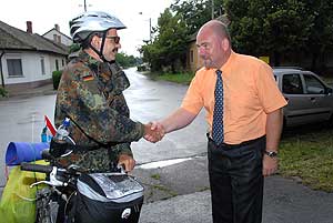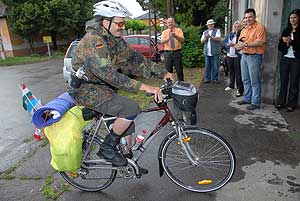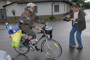 Lesznek megpróbáltatások, több emelkedőre számíthat, mint sík vidékre, figyelmeztette Cseuz László világjáró kerékpárosunk, aki szintén ott volt a fogadásán. Tímár szerint ez az igazi zarándoklat, amit ő csinál, s nem az, amit mások, hogy buszozás után pár kilométert gyalogolnak. Érinti többek között Máriaradnát, Makkosmáriát, Mariazellt, Neverst, Lourdest, nem maradhat ki Santiago de Compostela, majd Fatimába érkezése után még szeretne eljutni a fővárosba, Lisszabonba is. A küldetés megvalósításához napi 70-100 km közötti penzumot teljesít a magányos biciklista. Szentes, 2009. 07. 13.