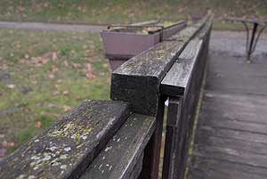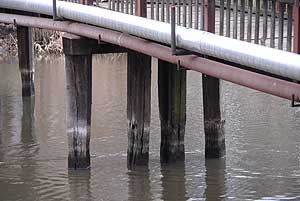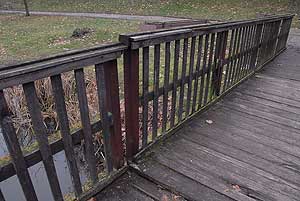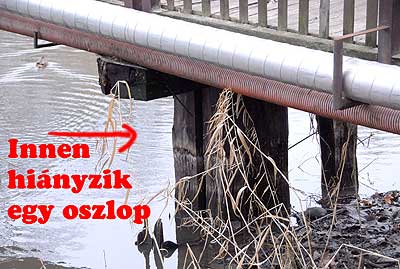 Jobban szemügyre vettük a híd tartórészeinek állapotát és látható, hogy minden tartó szekciónál 4-4 oszlopnak kell tartani a hidat, de a város felöli oldalon már csak három található. Itt látható az a 8 cm-es differencia is, amit már említettünk. Mivel az egyik oldalon a tartószerkezet hiány 4 cm-es billenést (csavarodást) okoz, a másik oldalon a korhadt gerenda szintén ennyit, a kettő összeadódik. Ha a nagyon szigorú műszaki szabályokat figyelembe vesszük, ennél már kevesebbért is zártak le hidat.