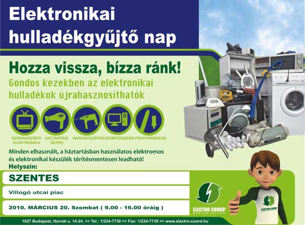 Háztartási elektromos-elektronikai eszközök (pl.: TV, hűtő, monitor, barkács és konyhai gépek stb.) gyűjtése ugyanitt ugyanebben az időben történik.