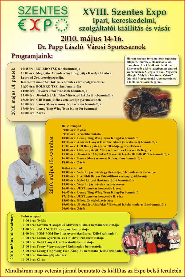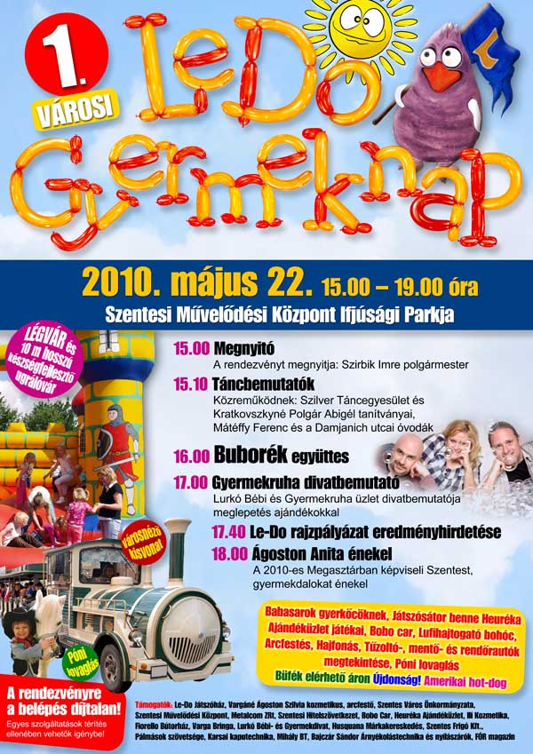 2010. május 22-én délután 15 órától közös összefogás eredményeként Városi Ledo Gyermeknap kerül megrendezésre Szentesen, a Szentesi Művelődési Központ Ifjúsági Parkjában. Az ötletgazdák és egyben főszervezők: a Le-do Játszóház és Vargáné Ágoston Szilvia kozmetikus, arcfestő úgy gondolták, hogy – hagyományteremtő céllal - bővítik a városban lévő gyermeknapi programkínálatot. Szentes Város Önkormányzata, a polgármester fővédnöksége mellett számos szentesi vállalkozó és egyesület állt ezen rendezvény, s e jó ügy mellé, akik segítségét, támogatását ezúton szeretnék megköszönni a szervezők. A műsort összeállítók a gyerekek minden korcsoportjára gondolva állították össze a műsortárt. Így többek között a legkisebbeket babasarok, az óvodásokat és kisiskolásokat ugrálóvár, arcfestés, Bobo car, pónilovagoltatás; míg a nagyobb gyerekeket egy 10 méter hosszú kalandparkkal egybekötött ugrálóvár várja. Korosztálytól függetlenül minden gyerkőcöt vár a játszósátor lufihajtogató bohóccal, arcfestéssel, hajfonással; a tűzoltó-, mentő- és rendőrautók megtekintése, a gyermekruha bemutató és a városnéző kisvonat. A kulturális műsorok keretében a Szilver Táncsport Egyesület és Kratkovszkyné Polgár Abigél tanítványainak produkcióit láthatják az érdeklődők, ezen kívül pedig fellépnek a Mátéffy Ferenc és a Damjanich utcai óvodások, illetve két koncert is várja a látogatókat. Délután következik a Buborék együttes, akik a Minimax mesecsatornán sokszor látható Alma együttes előzenekaraként koncerteztek, de nagy sikerrel játszottak a Művészetek Palotájában is. A másik koncertet adó az az Ágoston Anita lesz, akiért reméljük, sokáig izgulhatunk majd az idei Megasztárban, ugyanis bejutott az elődöntőbe. Bár a rendezvény díjtalan, de lesz pár szolgáltatás (büfé, árusok, kisvonat és ugrálóvár), amelyért fizetni szükséges. A befolyt összeget jótékonysági célra – két óvoda javára - fordítják a szervezők. Művelődési és Ifjúsági Ház parkja, 15.00-19.00 óra