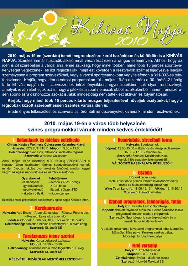 2010. május 19-én (szerdán) ismét megrendezésre kerül hazánkban és külföldön is a KIHÍVÁS NAPJA. Szentes immár huszadik alkalommal vesz részt ezen a rangos eseményen. Ahhoz, hogy az idén is jól szerepeljen a város; arra lenne szükség, hogy minél többen, minél több 15 perces sporttevékenységet végezzenek, és azt regisztrálják, majd ezt követően a résztvevők számát lejegyezve leadják személyesen a program szervezőknél, vagy a városi sportcsarnokban vagy telefonon a 311-032-es telefonszámon. Kérjük, hogy idén a városi programokon túl - május 19-én (szerdán) a 00. órától-21 óráig tartó kihívás napján is - szervezzenek intézményeikben, egyesületeikben sok olyan rendezvényt, amelyek révén elérhetjük azt is, hogy a játék és a sport nemcsak ebből az alkalomból, hanem rendszeresen sportolásra ösztönözze azokat is, akik mindezidáig nem tették ezt aktívan és folyamatosan. Kérjük, hogy minél több 15 perces kitartó mozgás teljesítésével növeljék esélyünket, hogy a legjobbak között szerepelhessen Szentes városa idén is. Eredményes felkészülést és színvonalas, örömteli rendezvényeket kívánunk minden résztvevőnek.