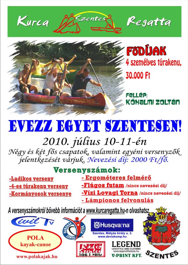 Néhány hét van már csak hátra a III. Kurca Regattáig, amit 2010. július 10-11-én rendeznek a szokásos helyszínen Szentesen a Kurca városi szakaszán. Nevezni már most is lehet a honlapon ( www.kurcaregatta.hu ), de jelentkezésre július 10-én reggel is lesz még lehetőség. A 4-es egységek versenyén - a Pola-Kajak felajánlásának köszönhetően - idén is egy új túrakenut nyer a győztes csapat, a Flúgos futam legötletesebb alkotását 30.000 Ft-tal jutalmazzák. A ladikos versenyre idén párosok jelentkezését várják. Szombaton itt lesz Kőhalmi Zoltán humorista.