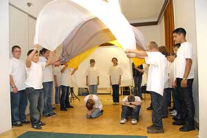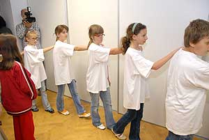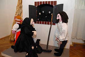 A másik terem egy fordított világot mutat be, s nem véletlenül vezet oda az út egy kulcslyukon keresztül. Kíváncsi módon átnézhetünk ebbe a másik világba, ahol mesefigurákkal találkozhatunk. A kis gömböc meséjével azt illusztrálják, hogy az ember mind többet akar. Mellette a kiskondás bicskával vár, hogy kiszúrja a gömböcöt, átvitt értelemben a fogyasztói társadalomra is ez vár, ki tudja, mikor következik be. A három kívánság című mesében a telhetetlen ember orrára nő a kolbász. A mindent járó malmocska üzenete a fiataloknak szól: a világban nem adnak ingyen semmit. A negyedik mese szintén a fordított világot jelképezi, ahol a legrondább banya is képes átváltozni szép, fiatal leányzóvá. Szentes, 2010. 06. 17.