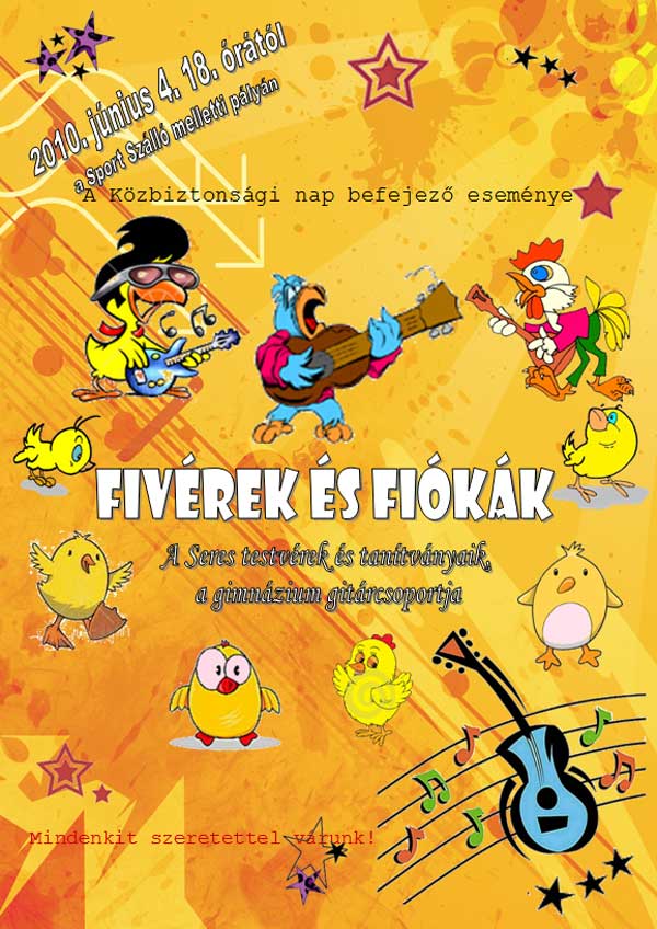 2010. június 4. 18 órától Sport Szálló melletti pálya FIVÉREK ÉS FIÓKÁK élő koncert A Seres testvérek és tanítványaik, a gimnázium gitárcsoportja 19.15 Pepita Kupa focidöntő