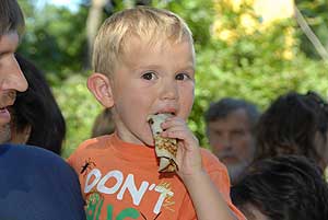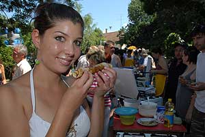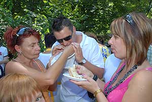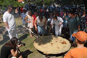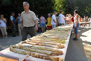 Egy másik palacsintás rekordot is felállítottak ezen a napon. A csapatok által megsütött palacsintákból egy hatalmas, 85 méternél hosszabb kígyót állítottak össze. A fedésben egymásra helyezett palacsintákat megtöltötték, majd feltekerték, és egymás mellé helyezett asztalokra fektették. A kígyó nemcsak mérete miatt volt különleges, hanem azért is, mert zöld és piros színű palacsintát is felhasználtak hozzá, az egyiket pisztácia-, a másikat vérnarancsaromával készítették. A fesztiválon készült képek ITT tekinthetők meg! A kígyó tésztájához százötven tojást, tíz kiló cukrot, fél mázsa lisztet, 125 liter tejet és 32 liter szódát használtak föl. Sebestyén István, a Guinness-rekordok magyarországi regisztrátora elmondta, bár már sokféle palacsintás rekord létezik, óriáspalacsintát és palacsintakígyót eddig még nem készítettek, így Derekegyházon az alaprekordokat sikerült felállítani. Szentes, 2010. 07. 14.