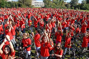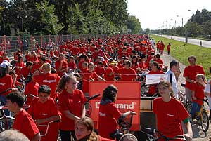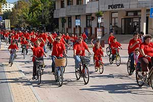 2500-an tekertek az autómentes napon Piros pólós kerékpárosok a Kossuth utcán