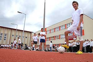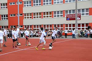 Több mozgásra biztatott minden gyereket, s mint mondta, szeretné megérni, hogy valaki innen az ő szavait most meghallgatva pár év múlva az ifjúsági válogatottságig jusson. A volt labdarúgó és szövetségi kapitány számtalan ajándékkal érkezett a gyerekekhez, viszont egy 11-es számú piros mezt Szirbik Imre polgármesternek is átadott. A gyerekek rögvest birtokba is vették a sportfelületet, hiszen az iskola labdarúgói bemutatóztak rajta, illetve a tanulók szalaggyakorlata avatta fel a pályát.