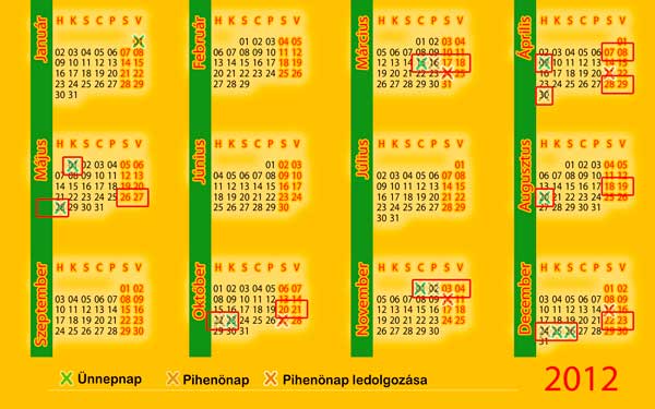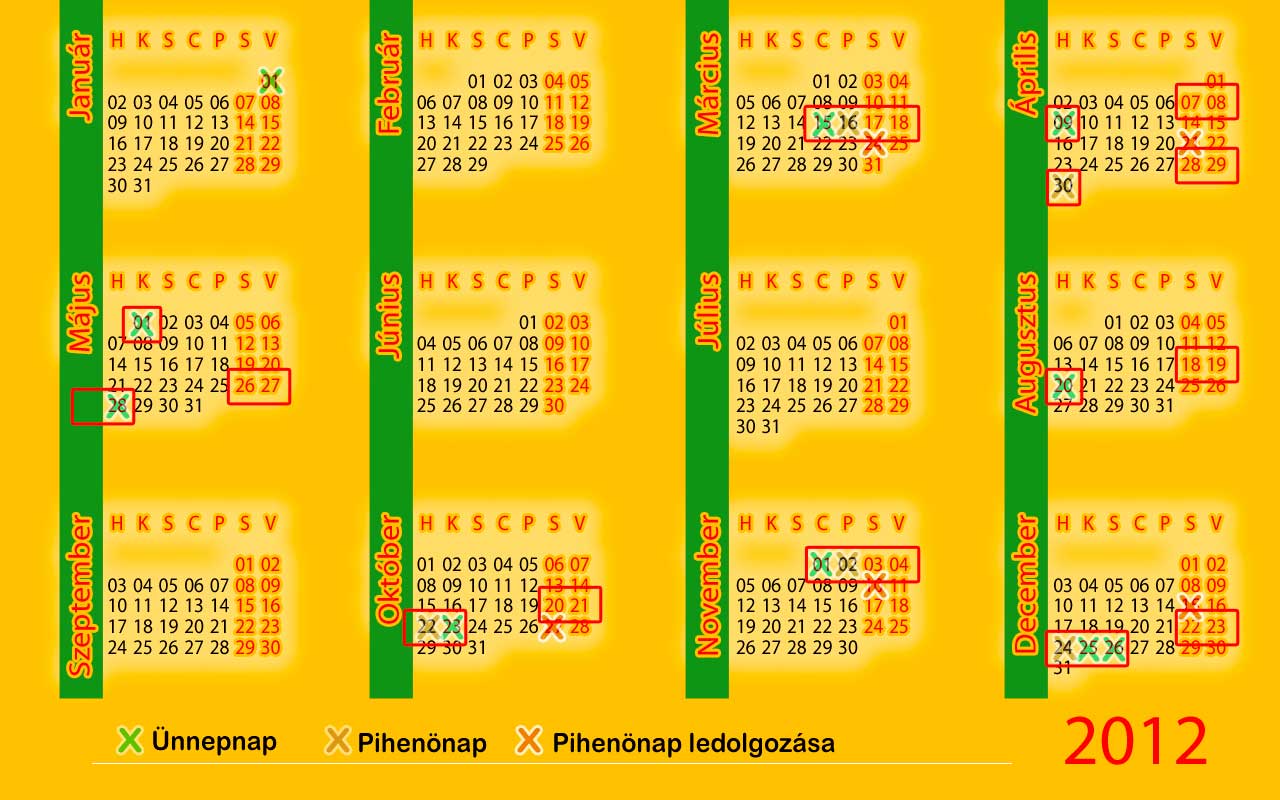 A Magyar Közlöny legutóbbi számában megjelent nemzetgazdasági miniszteri rendelet szerint március 16., április 30., október 22., november 2. és december 24. lesz pihenőnap. Ez egészül ki a húsvét- és a pünkösdhétfővel (április 9., illetve május 28.), így összesen nyolc hosszú hétvégével tervezhetnek 2012-ben a munkavállalók. A pihenőnapokat szombatonként - március 24-én, április 21-én, október 27-én, november 10-én, és december 15-én - kell ledolgozni. A rendelet kiterjed minden munkáltatóra és az általuk foglalkoztatottak munkarendjére, kivéve a megszakítás nélkül üzemelő és a rendeltetése folytán a munkaszüneti napokon is működő munkáltatókat, illetve az ilyen jellegű munkakörben foglalkoztatott munkavállalók munkarendjét.
