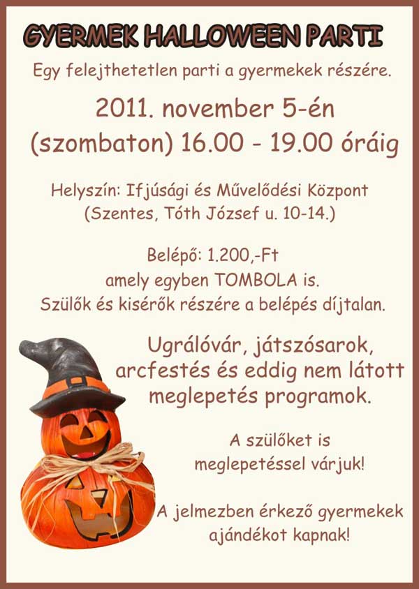 A Művelődési és Ifjúsági Házban Gyermek Halloween Partit szerveznek 2011. november 5-én 16.00-19.00 óráig. Ugrálóvár, játszósarok, arcfestés és meglepetés programok várják a gyermekeket és szüleiket. A jelmezben érkező gyermekek ajándékot kapnak!