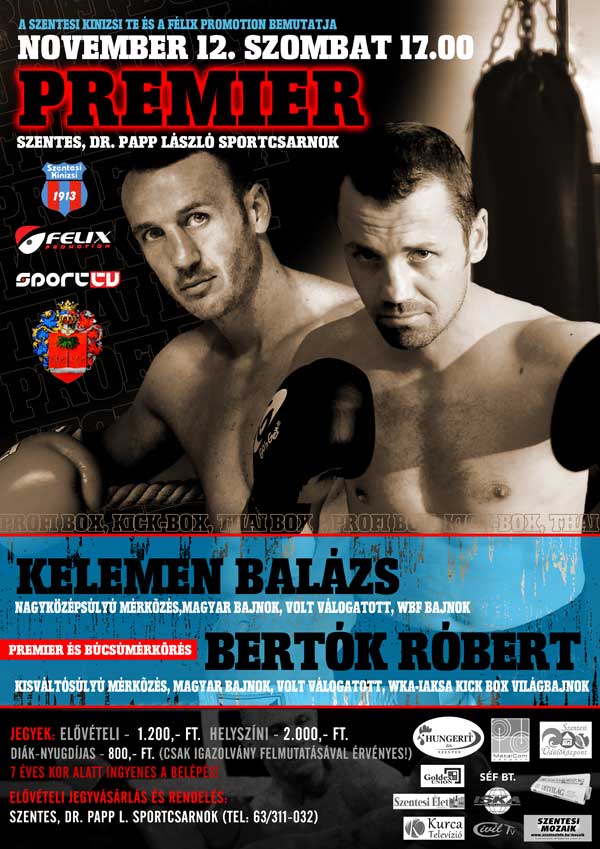 November 12-én Szentesen a dr. Papp László sportcsarnokban újból nagyszabású küzdősport gálát rendez a Szentesi Kinizsi SZITE képviseletében Bertók Róbert és a Felix Promotion vezetője, Rácz Félix.