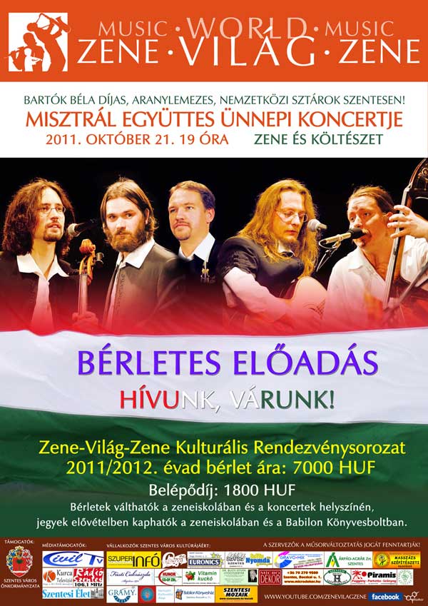 Az 1997-ben alakult Misztrál zenei együttes ismert és kevésbé ismert hazai és külföldi költők verseit zenésíti meg sajátos és egyéni hangon. Dalaikban ötvöződik a történelem, a hagyomány és a különleges, gyökereiben magyar és modern dallamvilág. Megalakulásuk után egy évvel, 1998 júliusában, a XIX. Kaláka Folkfesztiválon megnyerték a Kaláka Alapítvány fődíját. 2006-ban Bartók Béla díjat, 2008-ban Balassi Bálint emlékérmet, 2010-ben a Fiatalok a Polgári Magyarországért díját kapták meg. Este 19 órakor egy fantasztikus és felejthetetlen ünnepi koncerttel ajándékozzák meg városunk zene, kultúra kedvelő közönségét.