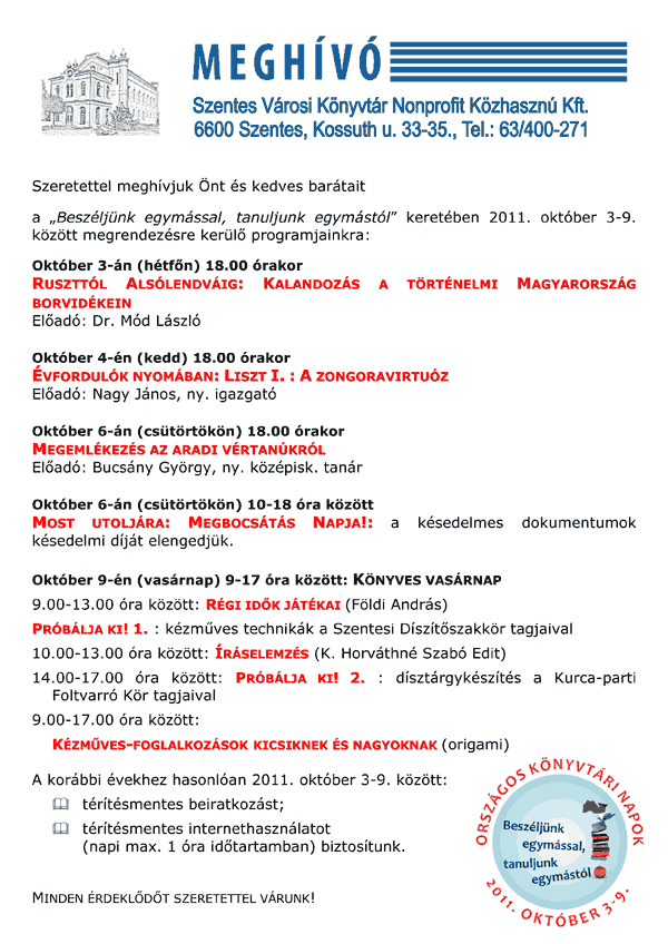 Október 6. Megbocsátás napja! Most utoljára! A késedelmes dokumentumok késedelmi díját elengedjük! Városi Könyvtár, 10.00 óra