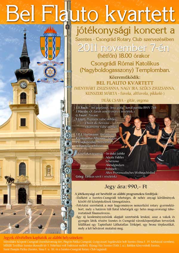 A Szentes-Csongrád Rotary Club november 7-én, jövő héten hétfőn jótékonysági koncertet rendez Csongrádon a Római Katolikus Nagytemplomban este 6 órakor. Közreműködik: a BEL FLAUTO KVARTETT. A jótékonysági est bevételét a Szentes-Csongrádi tehetséges, de nehéz anyagi körülmények között élő középiskolások támogatására fordítják, valamint a már hagyományos nemzetközi rotary gyermektábor szervezésére, mely a határon túli fiatal tehetségek egy hetes magyarországi táboroztatását finanszírozza. Egy új kezdeményezés alapjait is szeretnék lerakni, a vakok és gyengén látók részére, melyet Szentes és Csongrád városközpontjában terveznek felállítani egy Tapintható Láthatatlan Térképet, egy bronz térplasztikát, mely a két belvárost mutatná meg.