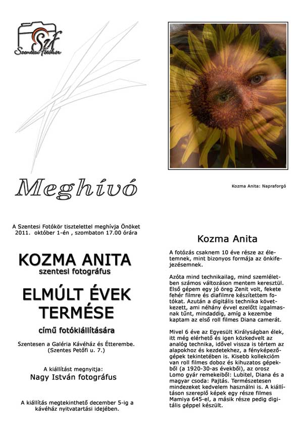 Kozma Anita szentesi fotográfus "Elmúlt évek termése" címmel mutatkozik be önálló kiállítással a szentesi közönség számára. A fotós társadalomban ismert a fiatal hölgy neve, mert számos pályázaton eredménnyel szerepel, most viszont önállóan mutatja be az "Elmúlt évek terméseit" számunkra a Galéria Kávéházban. A kiállítás október 1-jén nyílt meg, de az érdeklődők december 5-ig tekinthetik meg azt.