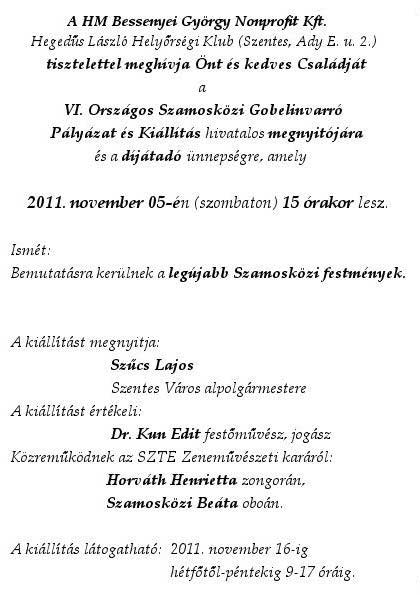 Ismét óriási tömegeket vonz Szentesre, a Hegedűs László Helyőrségi Klubba a pályázati kiállítás hivatalos megnyitója és az ünnepélyes díjátadó, melyre 2011. november 5-én kerül sor. A megnyitóra az ország minden szegletéből érkeznek vendégek. A kiállítást Szűcs Lajos alpolgármester nyitja meg délután 15 órakor.