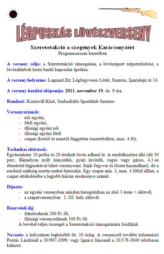 Szeretetakció a szegények Karácsonyáért programsorozat keretében a Kontavill Sport Klub és a Szabadidős Sportklub légfegyveres lövészversenyt rendez. A verseny célja: a Szeretetakció támogatása, a lövészsport népszerűsítése, a lövészklubok közti baráti kapcsolat ápolása. A verseny helyszíne és időpontja: Legrand Zrt. Légfegyveres Lőtér, Szentes, Ipartelepi út 14., 2011. november 19. de. 9 óra.