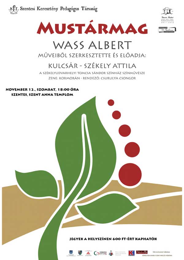 A székelyudvarhelyi Tomcsa Sándor Színház színművészének Kulcsár - Székely Atillának zenés irodalmi estjét tekinthetjük meg 2011. november 12-én a szentesi Szent Anna templomban. A Mustármag című előadáson Wass Albert műveiből hallhatunk részleteket melyre mindenkit vár a szervező a Keresztény Pedagógusok társasága.