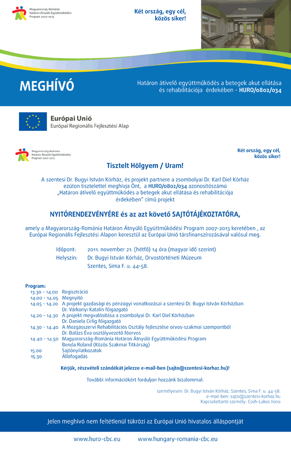 A szentesi Dr. Bugyi István Kórház, és projekt partnere a zsombolyai Kórház november 21-én tartja a„Határon átívelő együttműködés a betegek akut ellátása és rehabilitációja érdekében” elnevezésű uniós pályázati nyitó rendezvényét. A jövő héten, hétfőn, 14 órakor a Dr. Bugyi István Kórház, Orvostörténeti Múzeumába szervezett eseményen a két érintett intézmény főigazgatója beszél a projekt gazdasági és pénzügyi vonatkozásairól, valamint a megvalósításról.