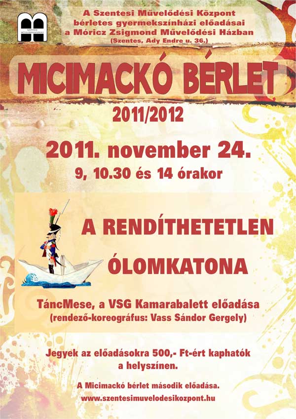 2011. november 24-én tekinthetjük meg a Micimackó bérlete keretében a VSG Kamarabalett előadásában a Rendíthetetlen ólomkatona című táncmesét a Móricz Zsigmond Művelődési Házban. A 9, a 10 óra 30 perc és a 14 órakor kezdődő előadásokra a Micimackó bérlet érvényes, valamint 500 forintos áron jegyek megvásárolhatók a helyszínen.