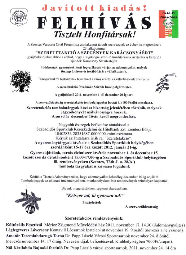 A Szentes Városáért Civil Fórumhoz csatlakozott társult szervezetek idén is megrendezik a "Szeretetakció a szegények karácsonyáért" gyűjtőakciójukat. November 1. és december 20. között 100 forintos áron tombolajegyet lehet vásárolni az oktatási intézményekben, munkahelyeken és a rendezvények helyszínén, amelyet gálaműsor keretében december 16-án húznak ki a Móricz Zsigmond Művelődési Házban. Gyermekjátékokat, tartós élelmiszert, kisebb pénzadományt és tombolatárgyat december 1-től 15-ig szerdánként 15 és 17 óra között lehet leadni a Szabadidős Sportklubban (Tóth J. u. 28/A). A nagyobb összegeket a Kereskedelmi és Hitelbank szentesi fiókja 10402836-28351687-0000000 számlaszámra utalhatják "Szeretetakció" megjegyzéssel. A kezdeményezéshez kapcsolódik november 17-én, csütörtökön fél 3-tól a kulturális fesztivál (adománygyűjtés). Légfegyveres lőverseny november 19-én, szombaton 9 órától a Kontavill lő-csarnokban. Amatőr teremlabdarúgó torna november 24-én, csütörtökön 8 órától (nevezni november 14-ig 17 óráig lehet) és a női kézilabda bajnoki forduló november 24-én, szombaton 14 órakor a sportcsarnokban.