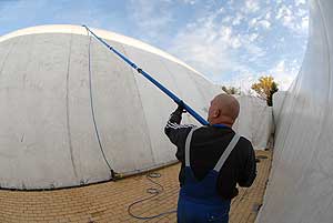 Immáron tíz esztendeje, hogy a most is felállításra került sátrat használják a Szentesi Üdülőközpontban. Ezalatt az idő alatt elég rendesen beszennyeződött. A szennyeződés nem csak por és víz elegye (azaz sár) hanem gombák és más baktériumok, melyek beszínezték a sátrat. Az eredeti fehér színből szürkés fehér árnyalat lett. Egy szegedi cég vállalta, hogy nem csak belülről, de kívülről is megtakarítja a sátrat. Lágy vizes technológiával speciális tisztító és gombátlanító szerrel sikamikálják a sátrak felületét. A technológiának fontos része a lágy víz, ami azért kell, hogy cseppmentesen száradjon a felület. A tisztítást speciális vegyszerek végzik egy kis kefe és lehúzó kombinálásával.