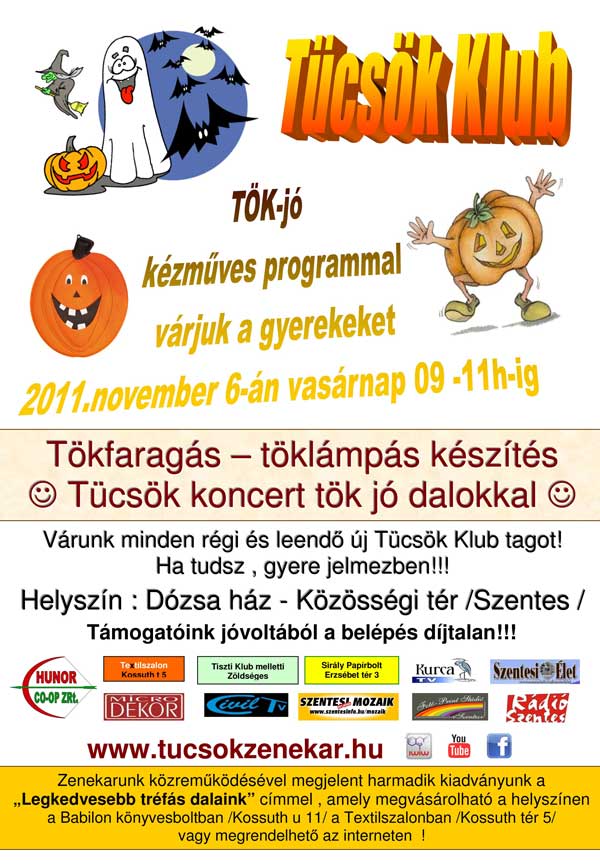 2011. november 6-án TÖK-jó kézműves programokkal várják a gyermekeket a Dózsa-házba. A Tücsök Zenekar által szervezett program (a Tücsök Klub) nagyon népszerű a gyermekek között és a támogatók jóvoltából ingyenesen látogatható! Szentes, 2011. 11. 03.