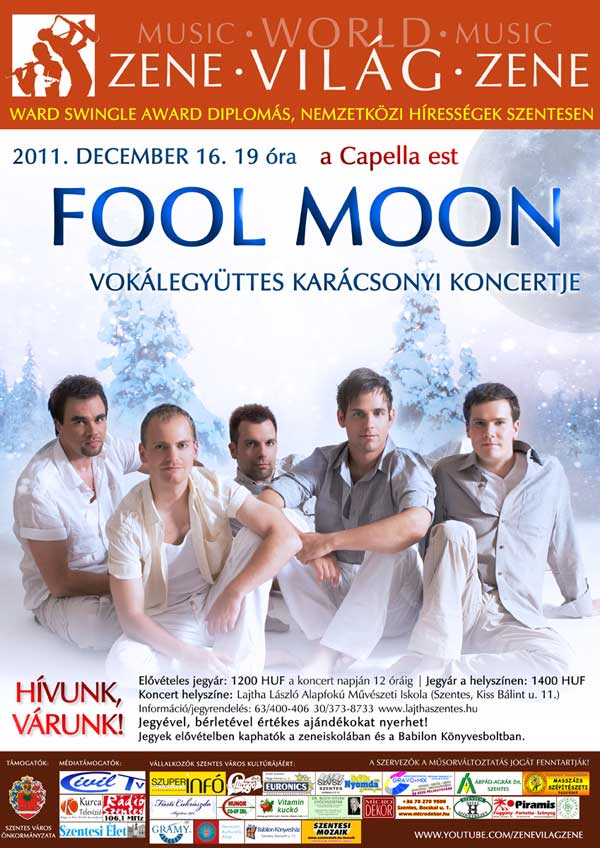A Fool Moon vokálegyüttes 2001-ben alakult Szegeden, és azóta - hazánkban egyedülállóan - a popacappella, azaz hangszeres kíséret nélküli éneklés popzenei műfaját népszerűsítik Magyarországon. 8 éves pályafutásuk alatt felléptek Magyarország legelismertebb előadóival, többek között Presser Gáborral, Szolnoki Péterrel, Malek Andreával vagy Edvin Martonnal, és 2008-ban képviselték Magyarországot Csézyvel a belgrádi Eurovíziós Dalversenyen. Nyugat-Európa fesztiváljainak állandó fellépői, de koncerteztek már Tajvanban és Dél-Koreában is. 2005-ben a Fool Moon első helyezést ért el pop kategóriában a grazi Ward Swingle A Cappella Versenyen, Európa legrangosabb ilyen jellegű megmérettetésén, így a kontinens legjobbjai közé emelkedhetett, 2006- ban pedig a VI. Tajvani Nemzetközi Acappella Versenyen kapott első helyezést és két különdíjat. A vokális zene népszerűsítése céljából 2005-ben életre hívták Szegeden a "Fool Moon" Nemzetközi A Cappella Fesztivált, az első ilyen jellegű rendezvényt az országban, mely a nagy sikerre való tekintettel évente megrendezésre kerül. Szentesre egy felejthetetlen karácsonyi műsorral érkezik az együttes, még meghittebbé varázsolva ünnepünket!