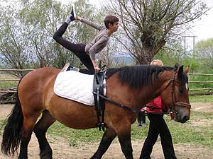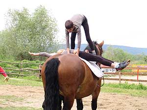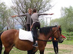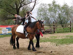- A délután a gyakorlásé volt, lovasaink megbarátkoztak az országunkban tréningezett terápiás lóval, Emesével. A második nap, a vasárnap a bemutatóké volt. Alapítványunk lovasai a játékos ügyességi feladatok bemutatásával kezdték, majd a helyi lovasok bemutatója következett. A programot Benedek Antal, Horváth Zsolt, Seres Ferenc egyéni, majd páros lovastorna bemutatója zárta. A meleg fogadtatás, a csodálatos környék bejárása a sikeres bemutatkozással felejthetetlen élmény marad mindannyiunknak. Szentes, 2011. 05. 10.