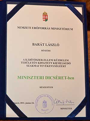 Réthelyi Miklós nemzeti erőforrás miniszter az ENSZ Kábítószer-ellenes Világnapja alkalmából, pénteken ünnepélyes keretek között szakmai elismeréseket adományozott. A kábítószer-ellenes küzdelem területén kifejtett kiváló szakmai tevékenysége, és a helyi kábítószerügyi stratégia kialakításában végzett érdemei elismeréséül Barát László, a szentesi Családsegítő Központ Közösségi tér szakmai vezetője, KEF koordinátora szakmai tevékenységéért miniszteri dicséretben részesült.