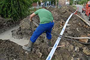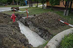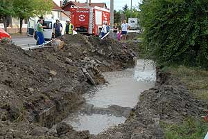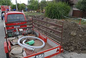 A VÍZMŰ szakemberei ezen a napon délelőtt dolgoztak ezen a szakaszon, amelyen a csőtörés keletkezett. A tűzoltók szivattyúkkal felszerelkezve vonultak ki, de nem kellett használniuk, mert a szakemberek ekkorra már elzárták a főnyomócsövet. A munkások elkezdték a szivattyúzást is, hogy mihamarabb elhárítsák a hibát! Szentes, 2011. 07. 21.