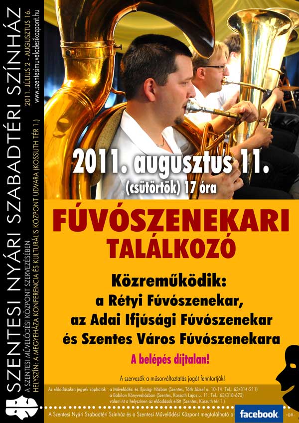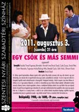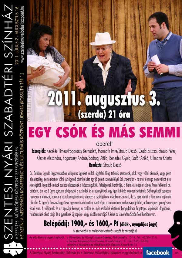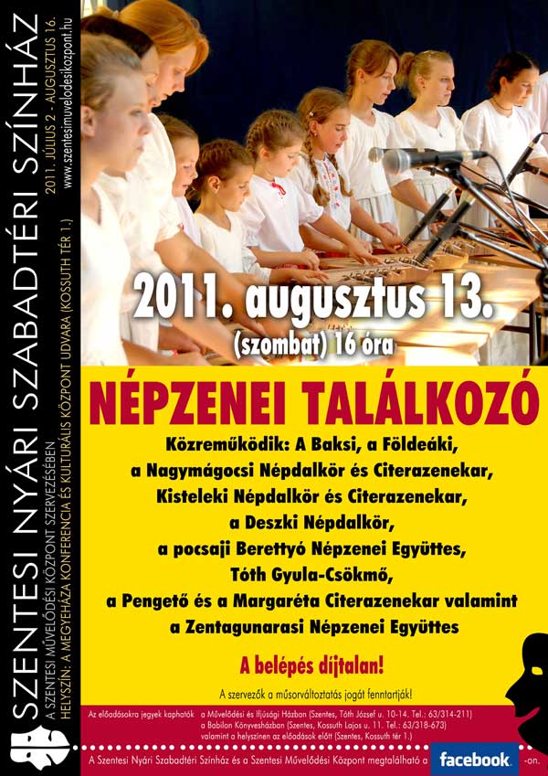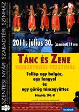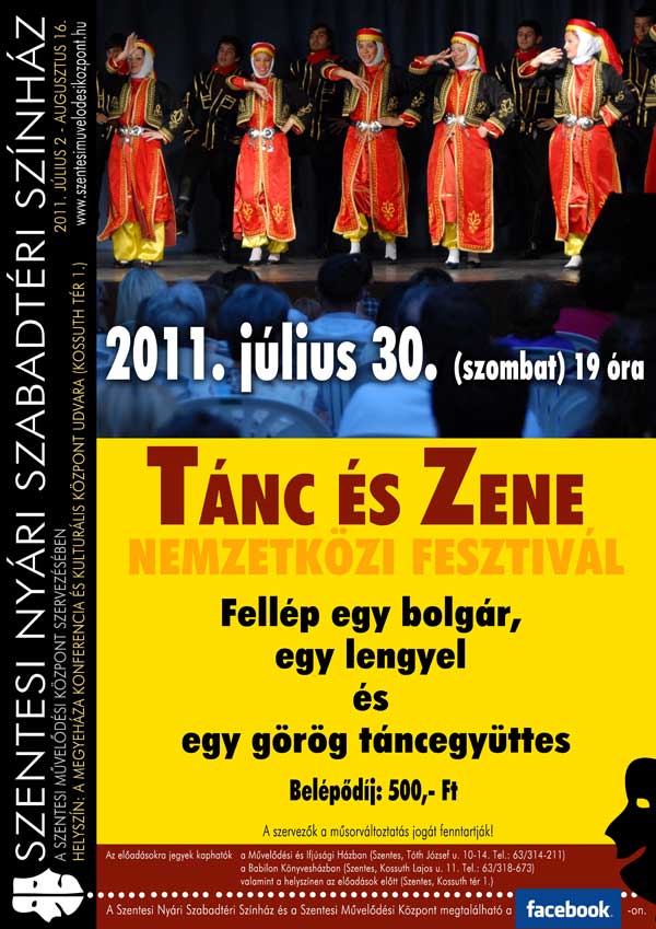 A plakátok kinagyíthatók! Július végén a Tánc és Zene Nemzetközi Fesztivál keretében egy bolgár egy lengyel és egy görög táncegyüttes szórakoztatja a közönséget a Megyeháza udvarán. Augusztus 3-án az Egy csók és más semmi előadás következik, mely után két ingyenes rendezvény lesz. Először fúvósok veszik birtokba a színpadot, majd augusztus 13-án a népzenéé lesz a főszerep. Végezetül augusztus 15-én Szinetár Dóra és Bereczki Zoltán koncertje zárja a nyári színházi programot. Jegyek kaphatók a Művelődési és Ifjúsági Házban, a Babilon Könyvesházban és az előadások előtt a helyszínen. Szentes, 2011. 07. 28.