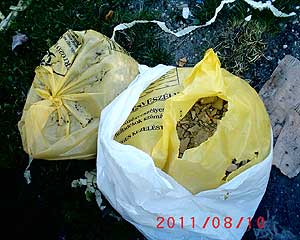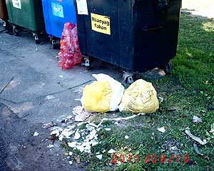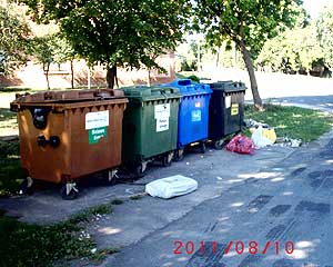 A fenti kép kezd valóra válni, miközben hatalmas felháborodást váltott ki még 2003-ban ez a művészi alkotás. A város igen sokat tesz annak érdekében, hogy minél zöldebb és minél körforgalmasabb legyen a város :-). Pár trehány ember azzal a tettével, hogy a szelektívgyűjtő szigeteket nem a rendeltetésüknek megfelelően használja, nem csak kárt okoznak, hanem veszélyeztetik azok környékét is. Egy-egy csak úgy otthagyott zacskó kellő táplálékot jelent a kóbor kutyáknak. Ők márpedig nem késsel és villával esznek, és nem óvatosan újheggyel bontják ki a "csomagot"! Az is megér egy misét, hogy mik vannak benne ezekben a csomagokban! A gyógyszerektől az injekciós tűig, megtalálható benne minden, csak a származását feltáró ajánlott levél blanketta nem! :-(